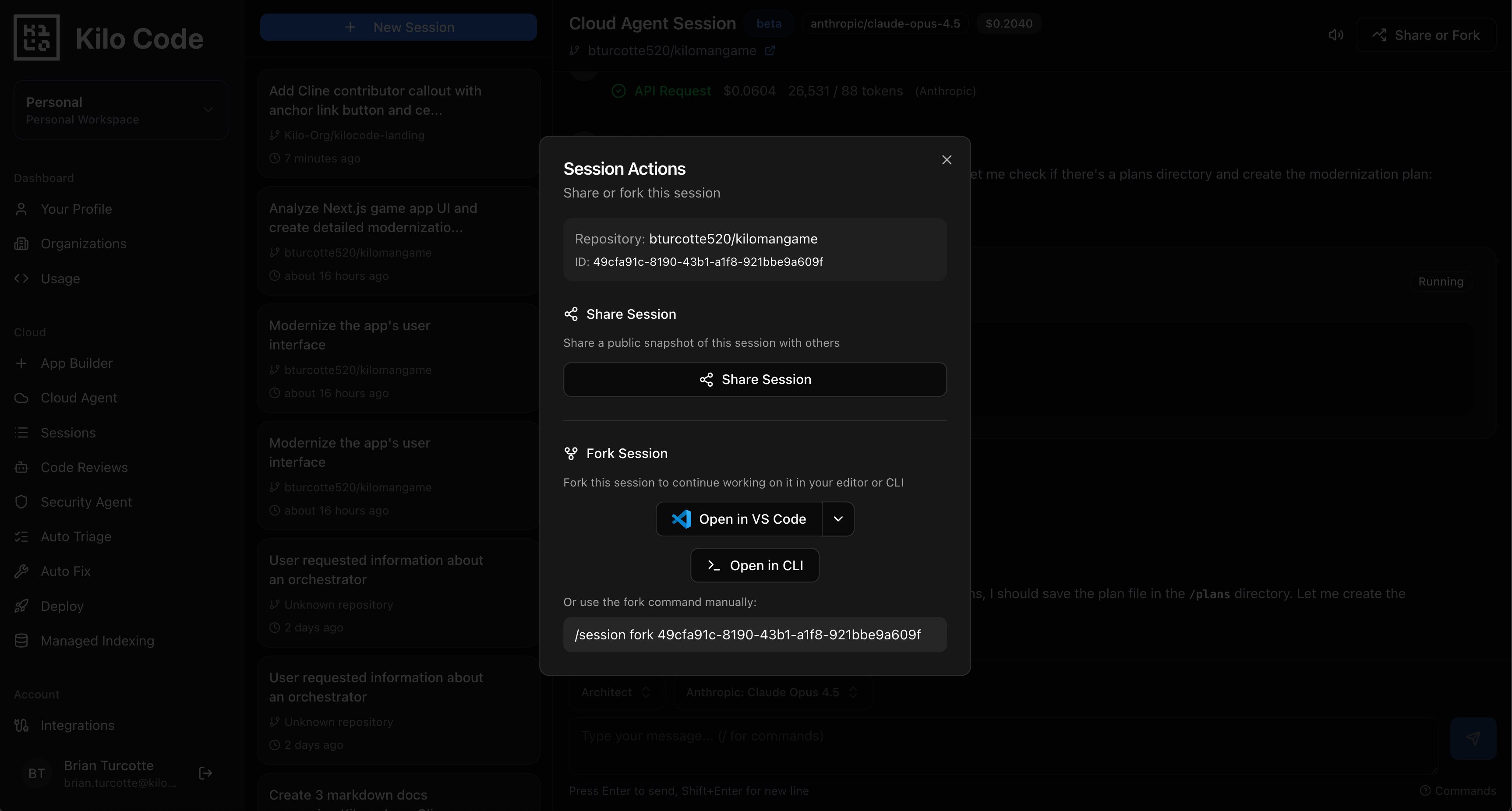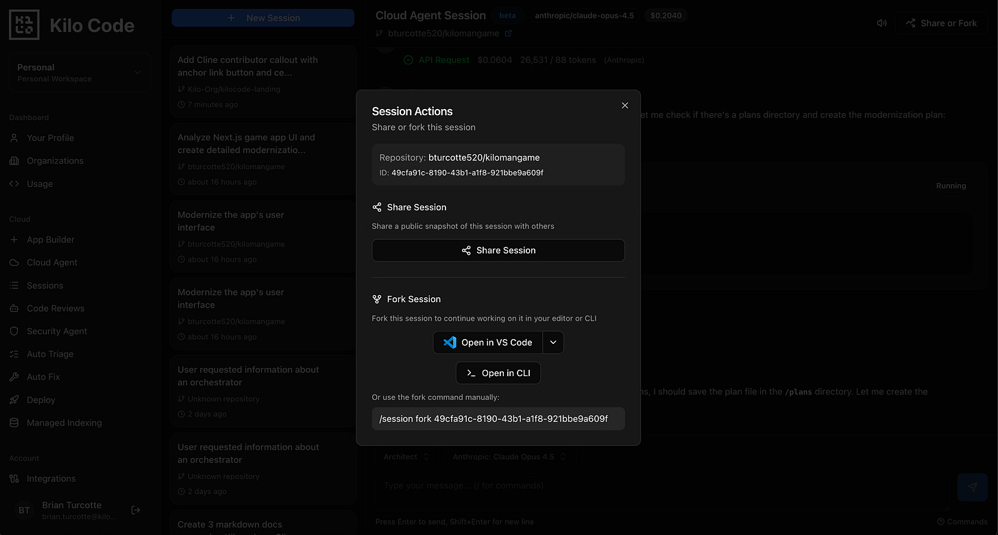 One-click session sharing for Cloud Agents sessions, so that your teammates can fork and resume the session in the browser, Kilo CLI, or IDE.