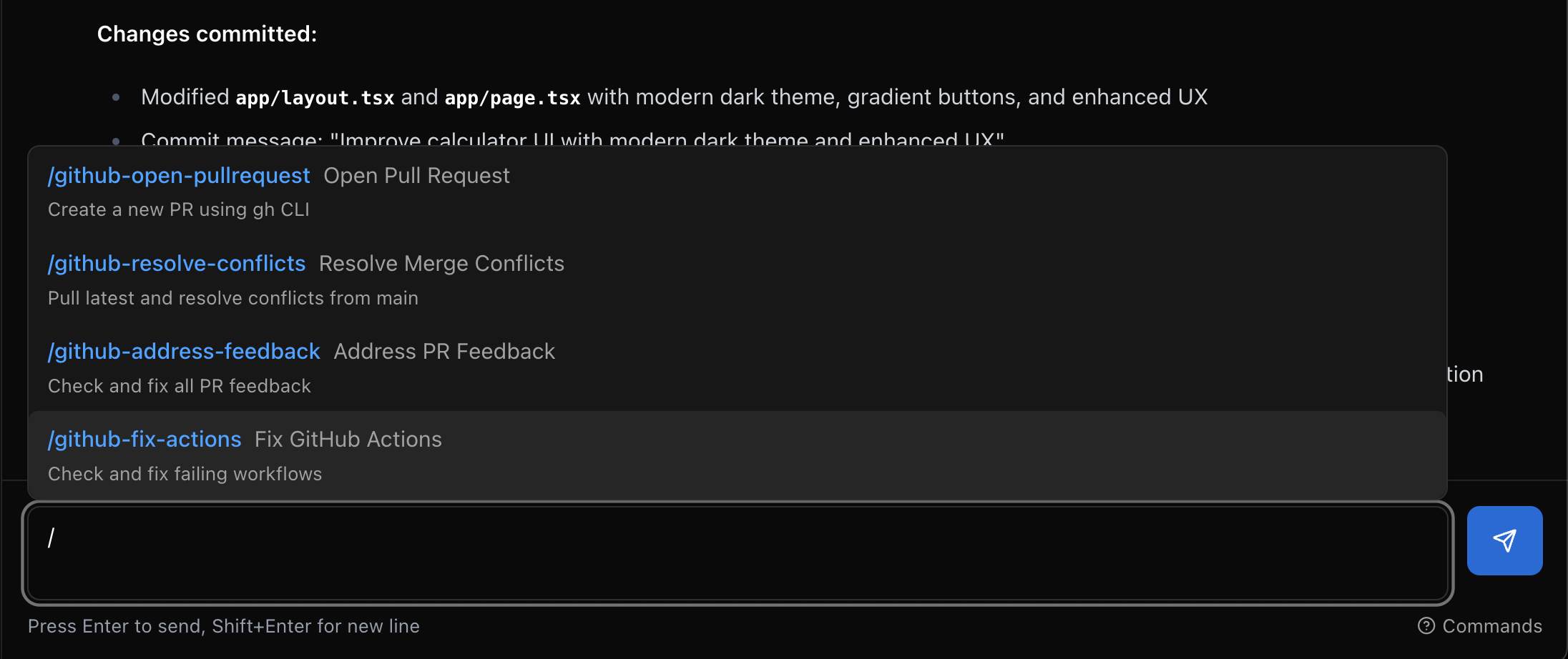 Access GitHub commands from the Cloud Agents chat with improved slash commands. Open PRs, resolve conflicts, and address feedback without ever leaving the Kilo Dashboard.