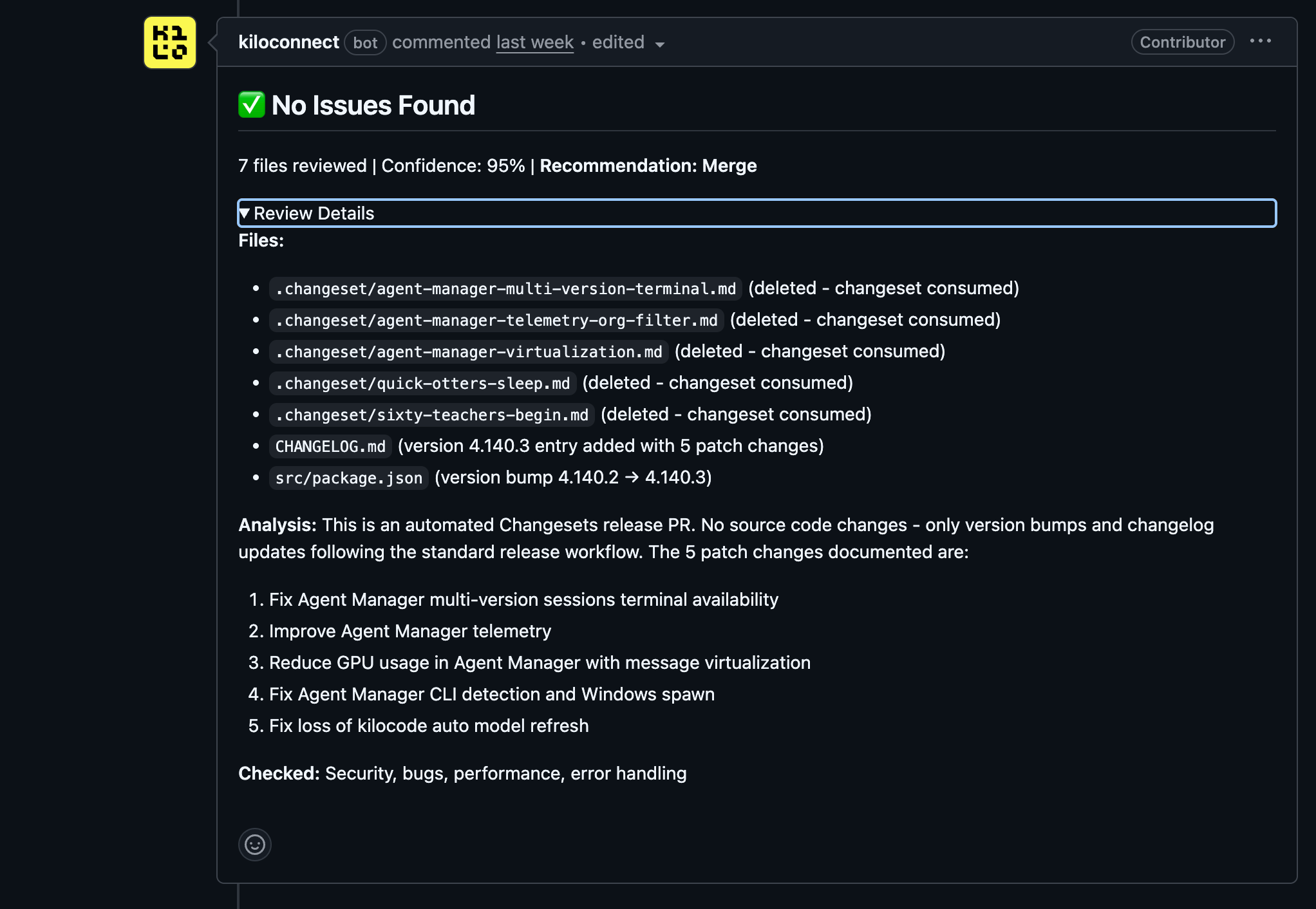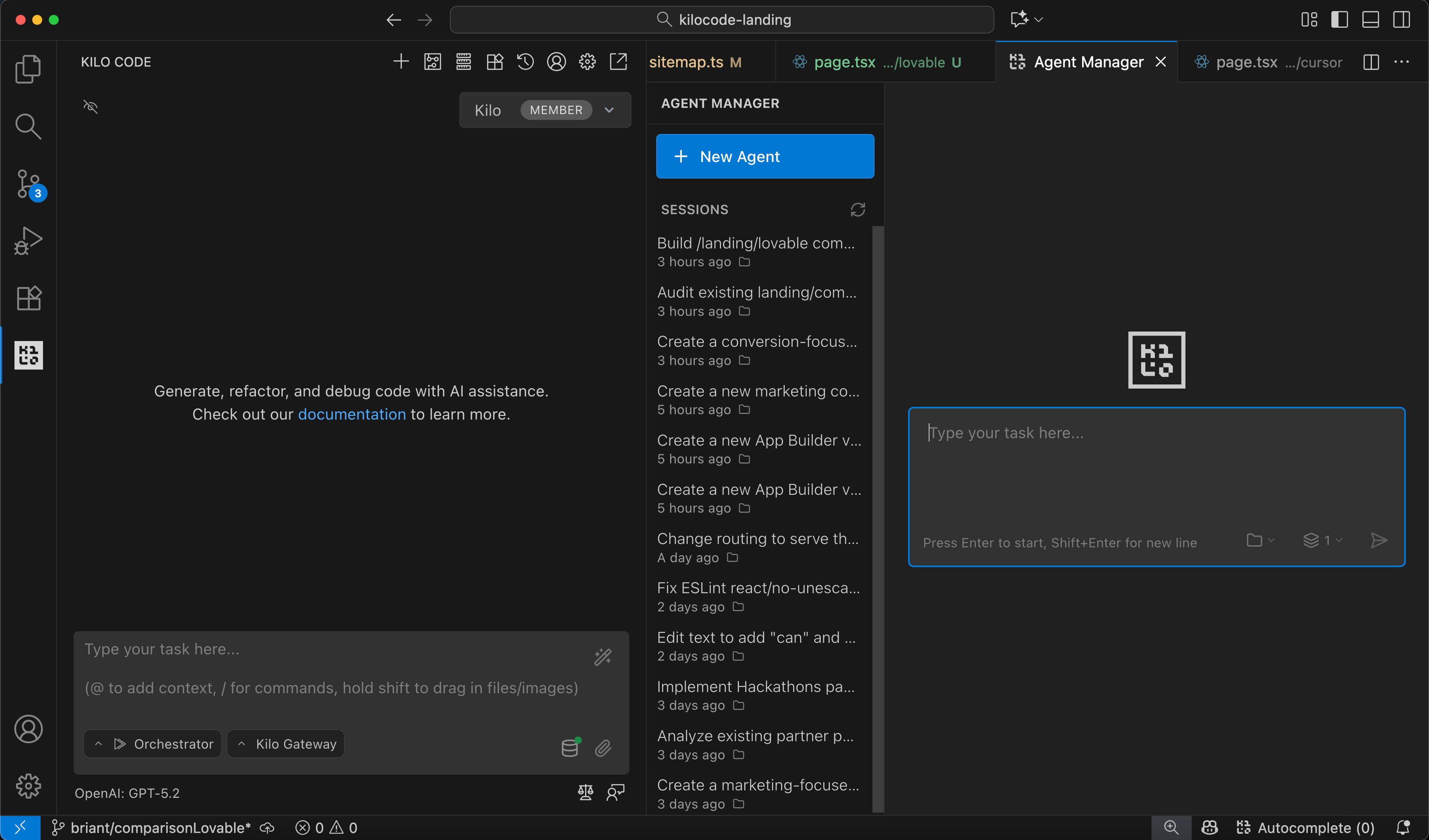 Parallel Agents — Run multiple Kilo agents without conflict in both the IDE and CLI. Agent Manager in the extension lets you launch 1-4 agents on git worktrees, each working on different tasks simultaneously.