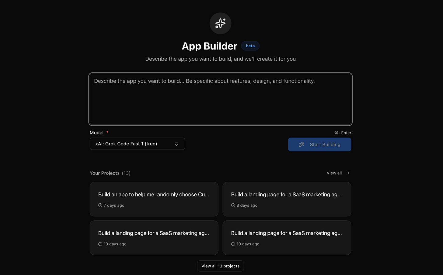 App Builder — Build live apps and sites from the web with a live preview. Like Lovable, but integrated into the Kilo platform. Deploy or export the code with one click when you’re ready.