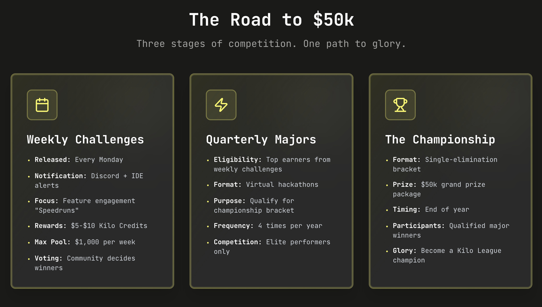 Kilo League isn’t just a hackathon; it is a season-long journey of competitions, learning tracks, and community to help you master the art of: