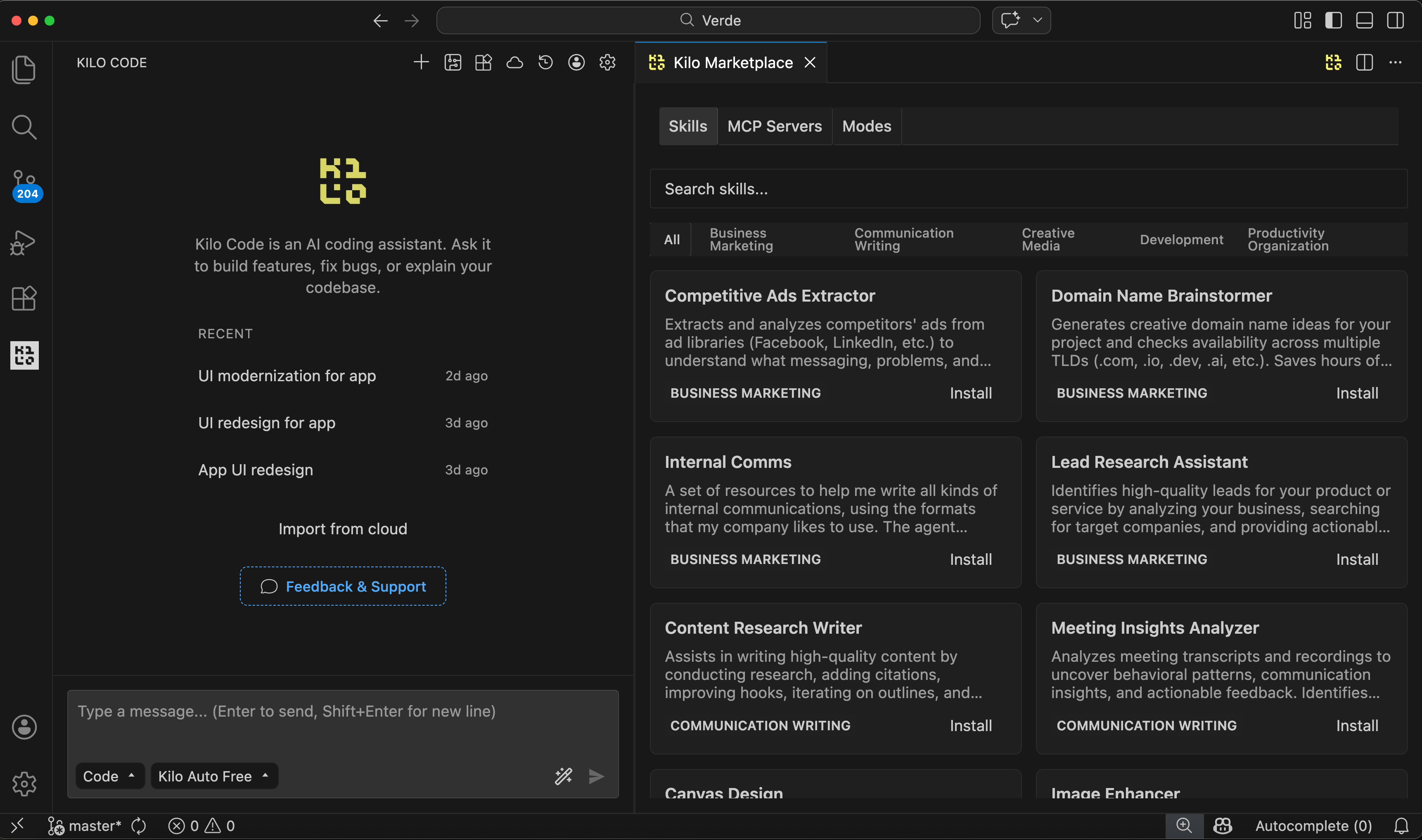 The Marketplace now has dedicated tabs for MCP Servers and Modes alongside the existing Skills tab. Browse, discover, and install MCP servers and custom modes directly from the extension without leaving your editor.