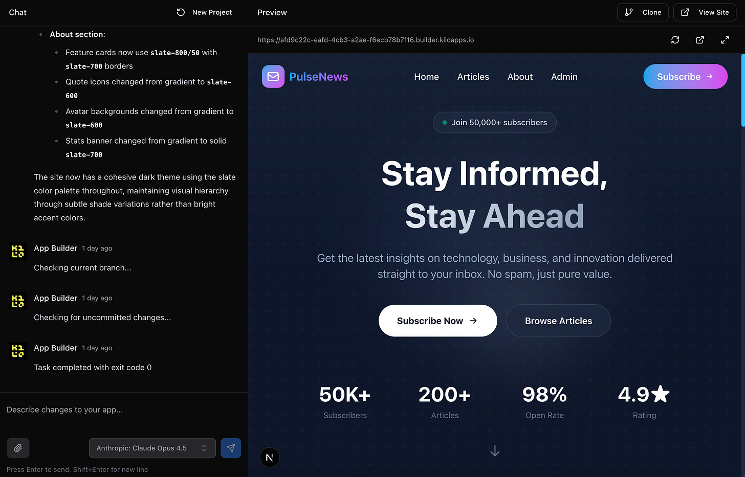 Deploy or go deeper. One click gets you a production URL. Or export to Kilo CLI/IDE and keep building with agents that already understand your codebase. This is the difference—you’re not exporting into the void. You’re moving to a more powerful interface within the same platform.