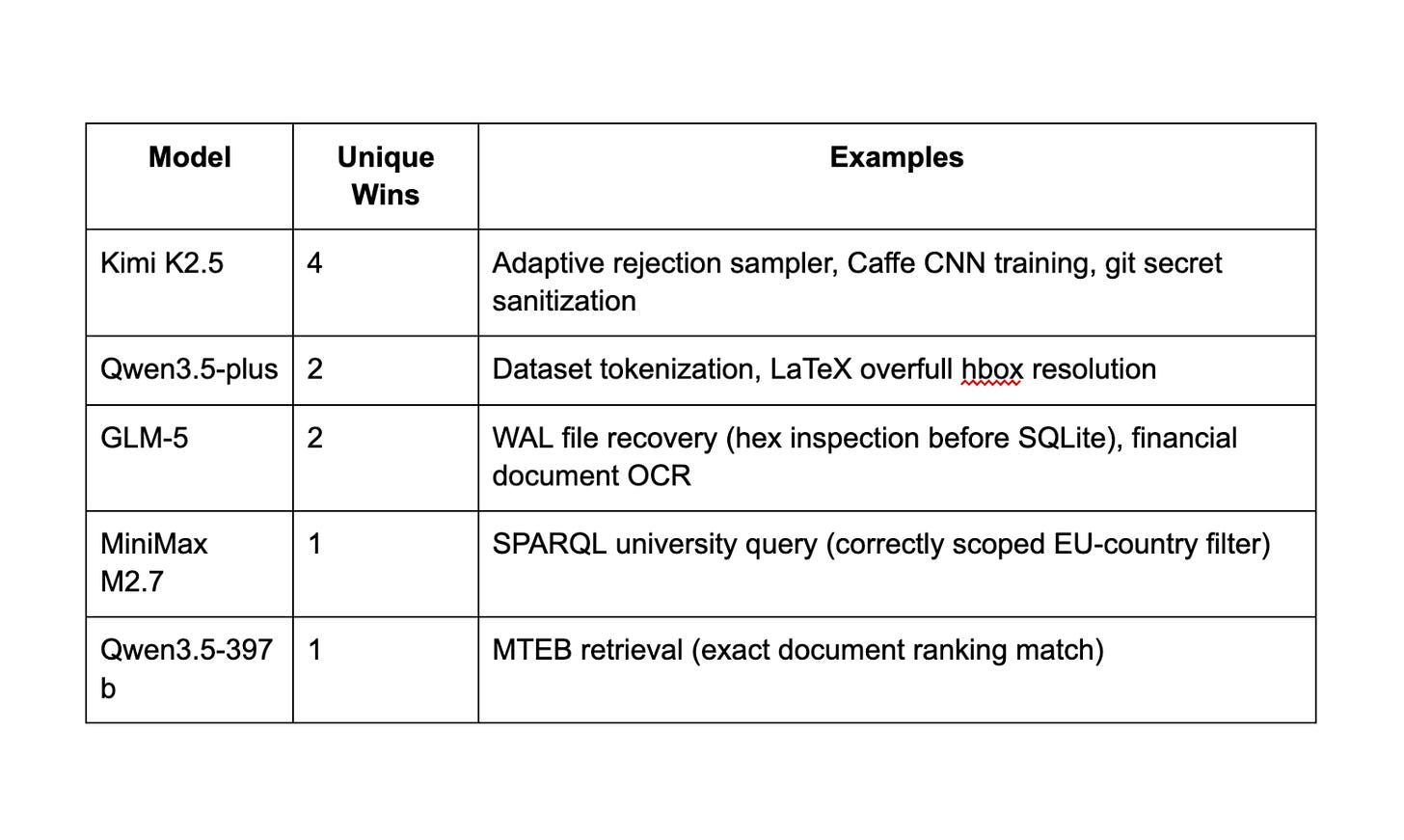 A hypothetical oracle that picks the best model per task would solve 60 out of 89 tasks (67%) — a 36% improvement over the best single model. These models aren’t interchangeable. They’re complementary.