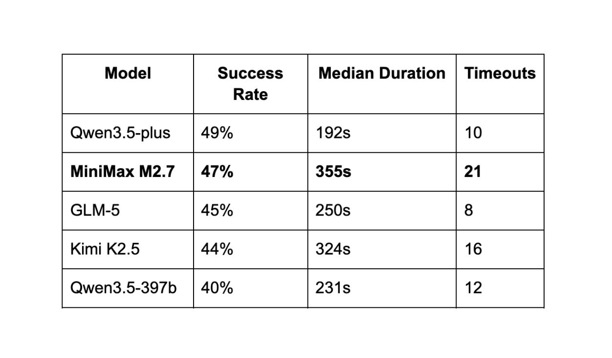 Consider a different model (even such as M2.1 or M2.5) when you need very fast iteration cycles or are working on well-scoped, time-sensitive tasks. M2.7’s median task duration (355s) is notably longer than its predecessors.