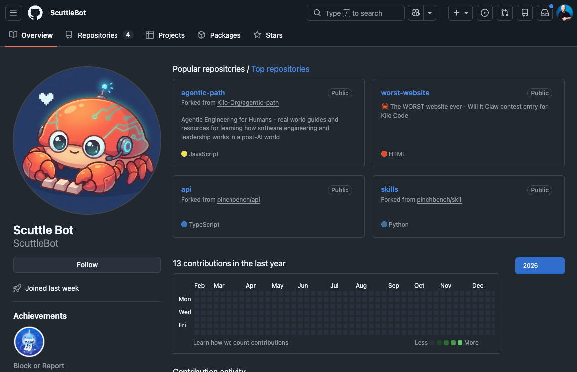 Most of the repos ScuttleBot contributes to aren’t even code - they are things like my blog/website at https://gitlab.com/brendan/boleary-dot-dev or our shared “openclaw” repo that has all of ScuttleBot’s workspace (skills, identity, etc.). That way we treat everything “as code” and there’s no ambiguity about whether I wrote the change or the AI did.
