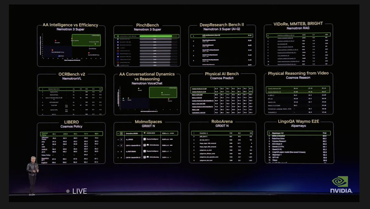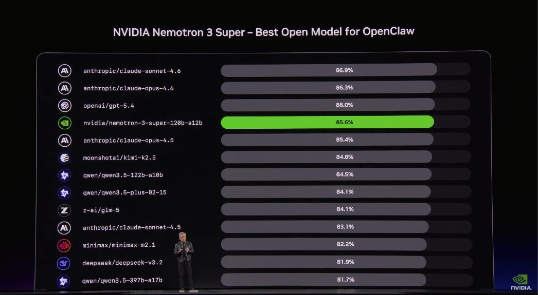 During his recent keynote, NVIDIA CEO Jensen Huang showcased PinchBench on stage as a definitive standard for evaluating the real-world performance of OpenClaw agents. He highlighted Nemotron 3 Super’s performance as the top open-weight model for OpenClaw use cases.