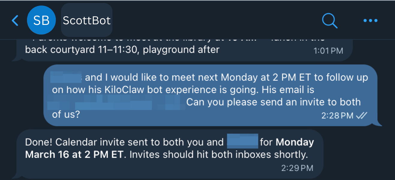 I was meeting with a friend and colleague and we agreed to sync again the following week. We both pulled up our calendars, found a time. I sent a message to KiloClaw. My contact received a calendar invite a minute later.