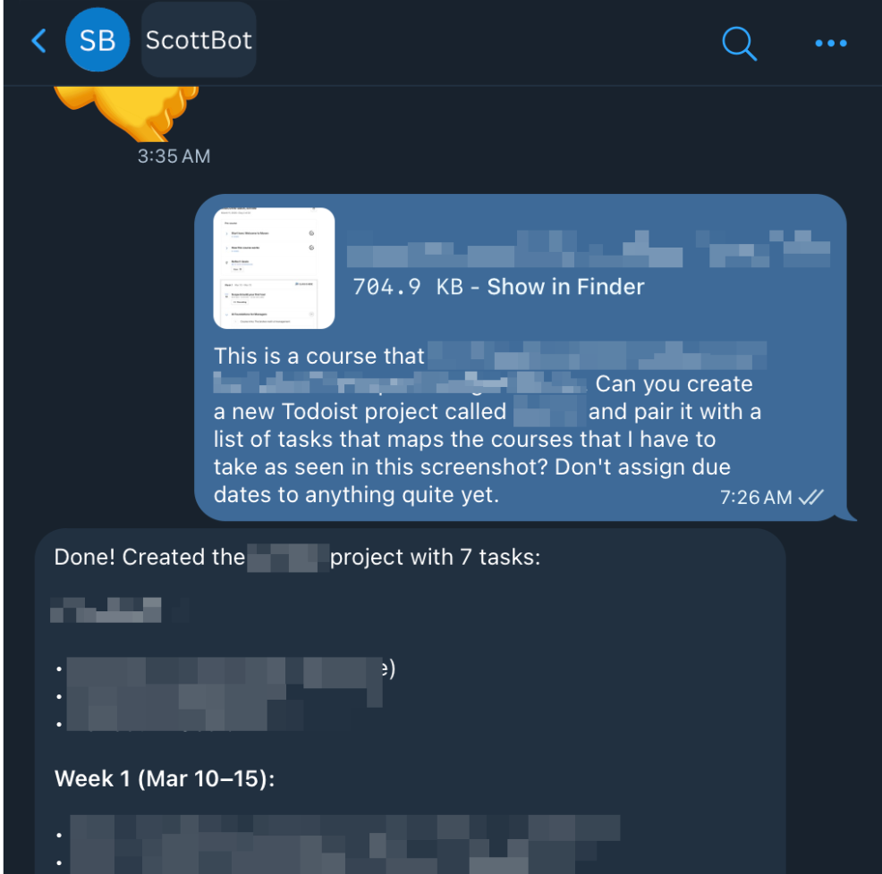 Last week, I had a new project land in my inbox. I downloaded the PDF, uploaded it to my KiloClaw bot on Telegram, and typed a simple prompt in natural language, essentially: Create a Todoist project for this and add the tasks based on these guidelines.