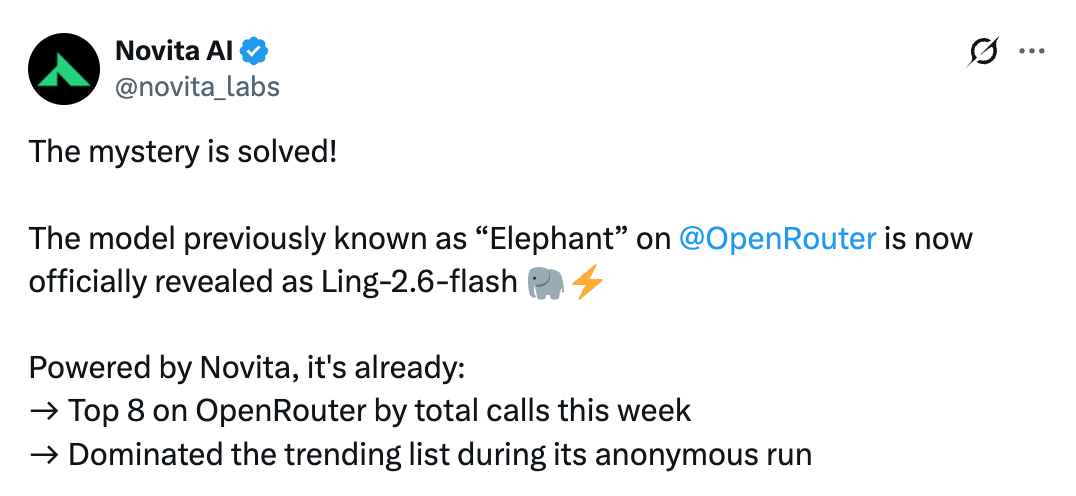 By releasing Ling-2.6-flash under a pseudonym, we wanted to let the model’s performance speak entirely for itself, free from any pre-existing brand bias or market expectations. The community’s blind tests confirmed what we already suspected: this model is an absolute powerhouse for developers building next-generation AI applications. With super fast inference from Novita, it was a win-win.