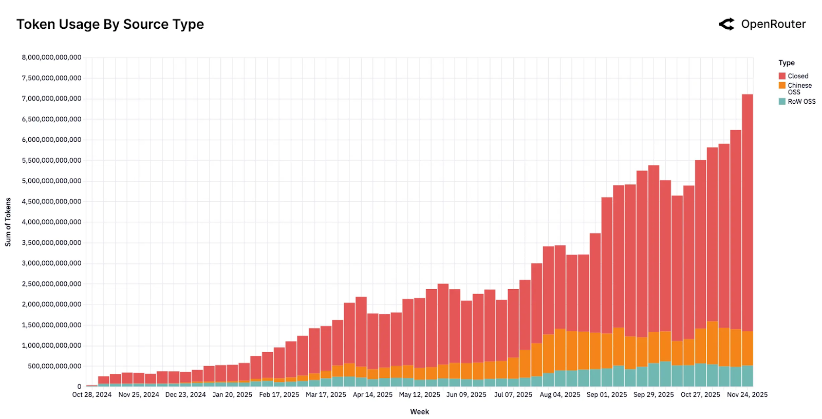 OSS models moved from fringe to around one third of overall usage across closed and open models combined