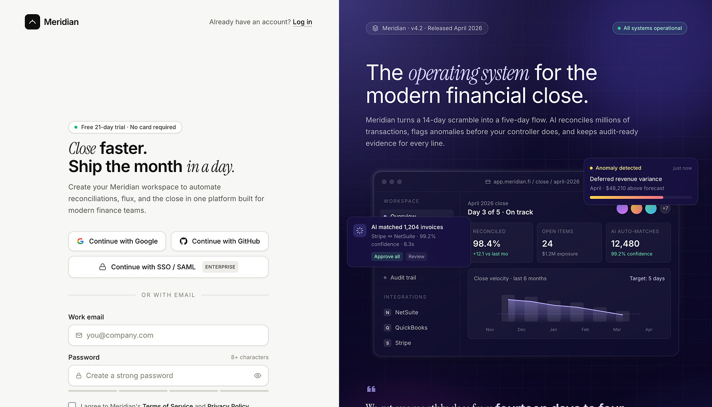 Claude Opus 4.7’s form is denser with detail: an “Enterprise SSO” button below the social auth options, icons inside the input fields, and the log-in link in its expected position. The right panel is a more developed product mockup with version and status indicators (”v4.2”, “All systems operational”). The headline (”Close faster. Ship the month in a day.”) uses the same italic-serif accent treatment Opus used on the landing page.