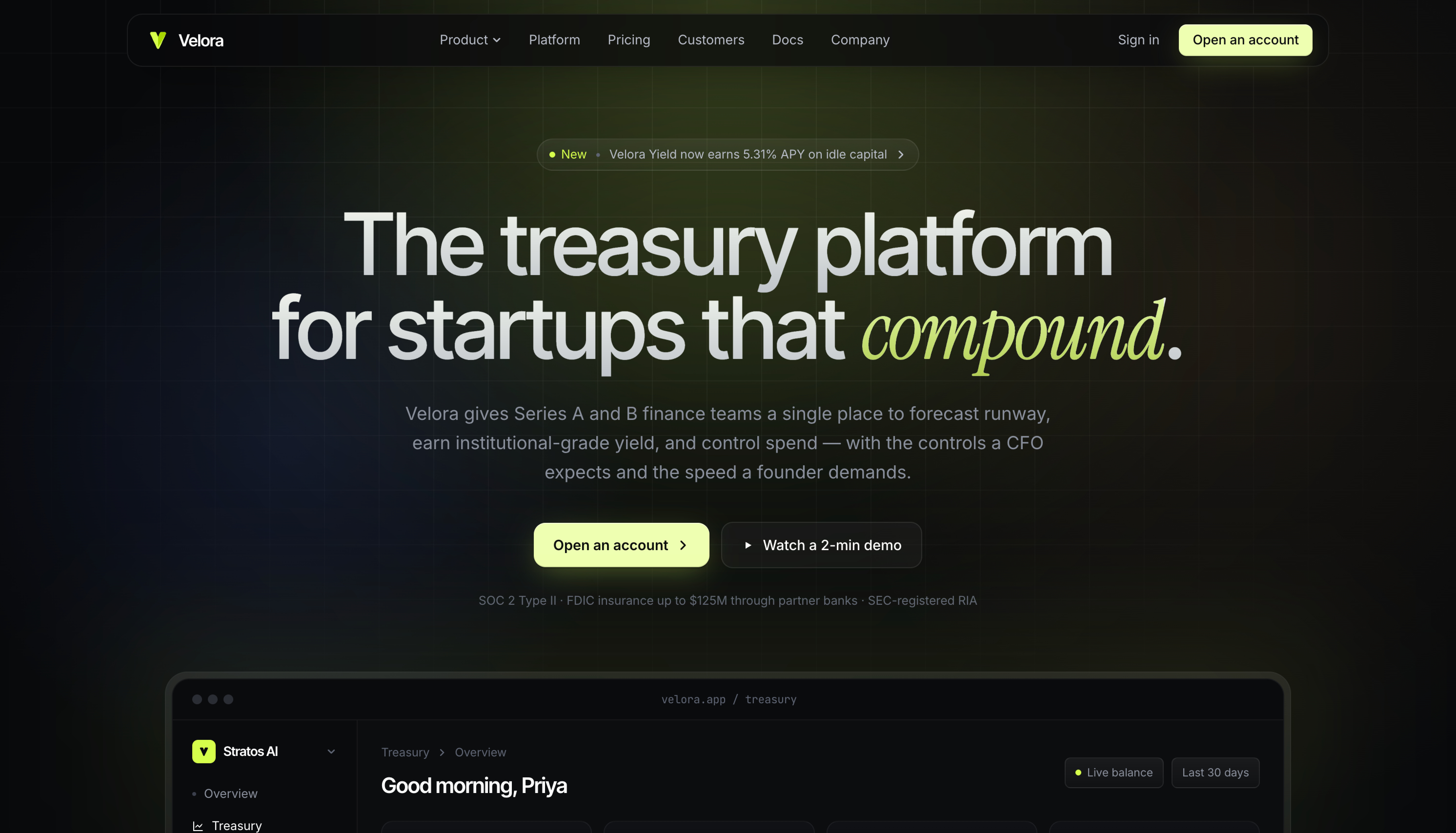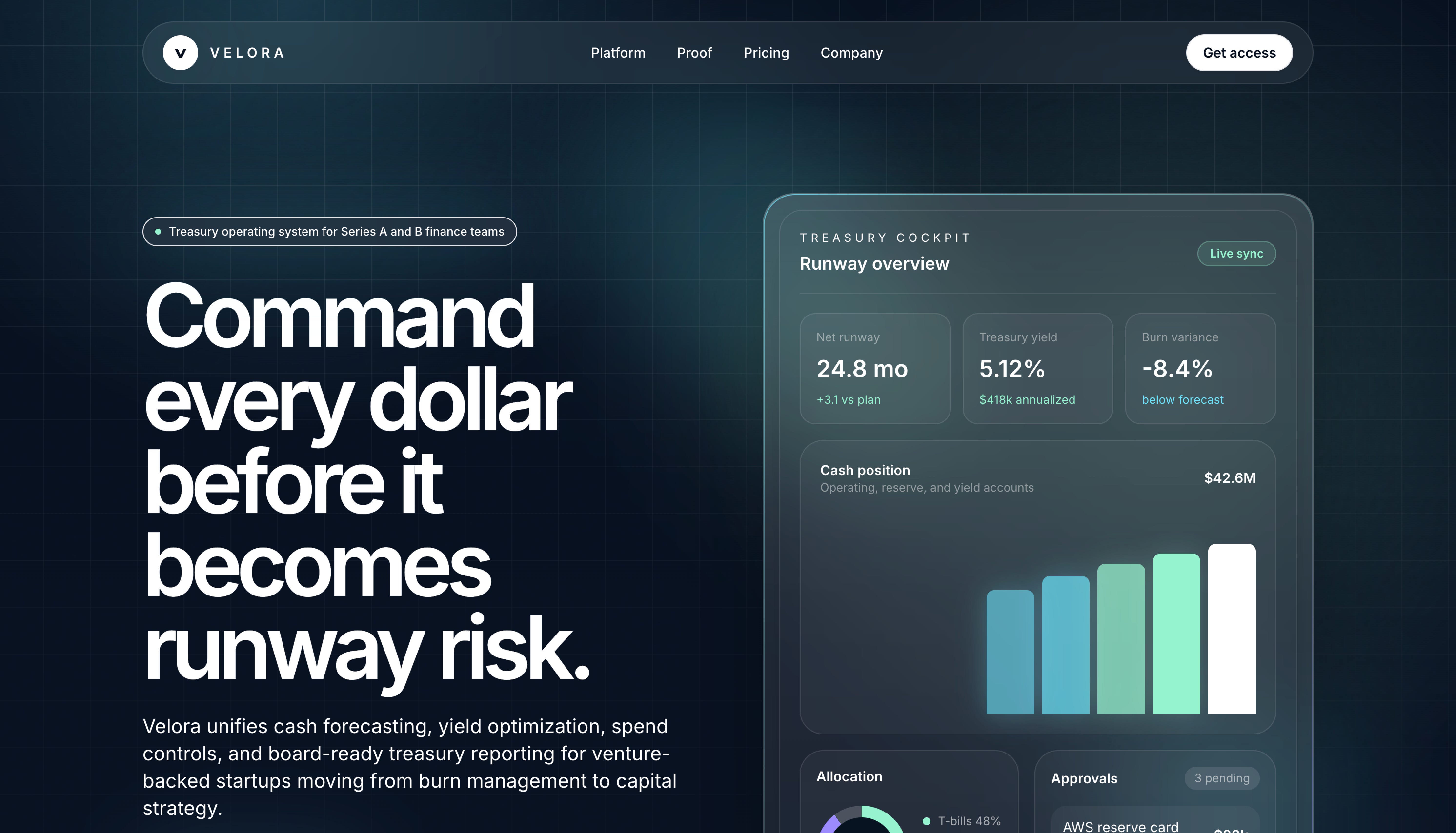 Design a premium landing page for a fintech startup called Velora. The product is a treasury management platform for venture-backed startups (think “Mercury for Series A and B companies”). The page should feel like Linear, or Stripe tier polish.
