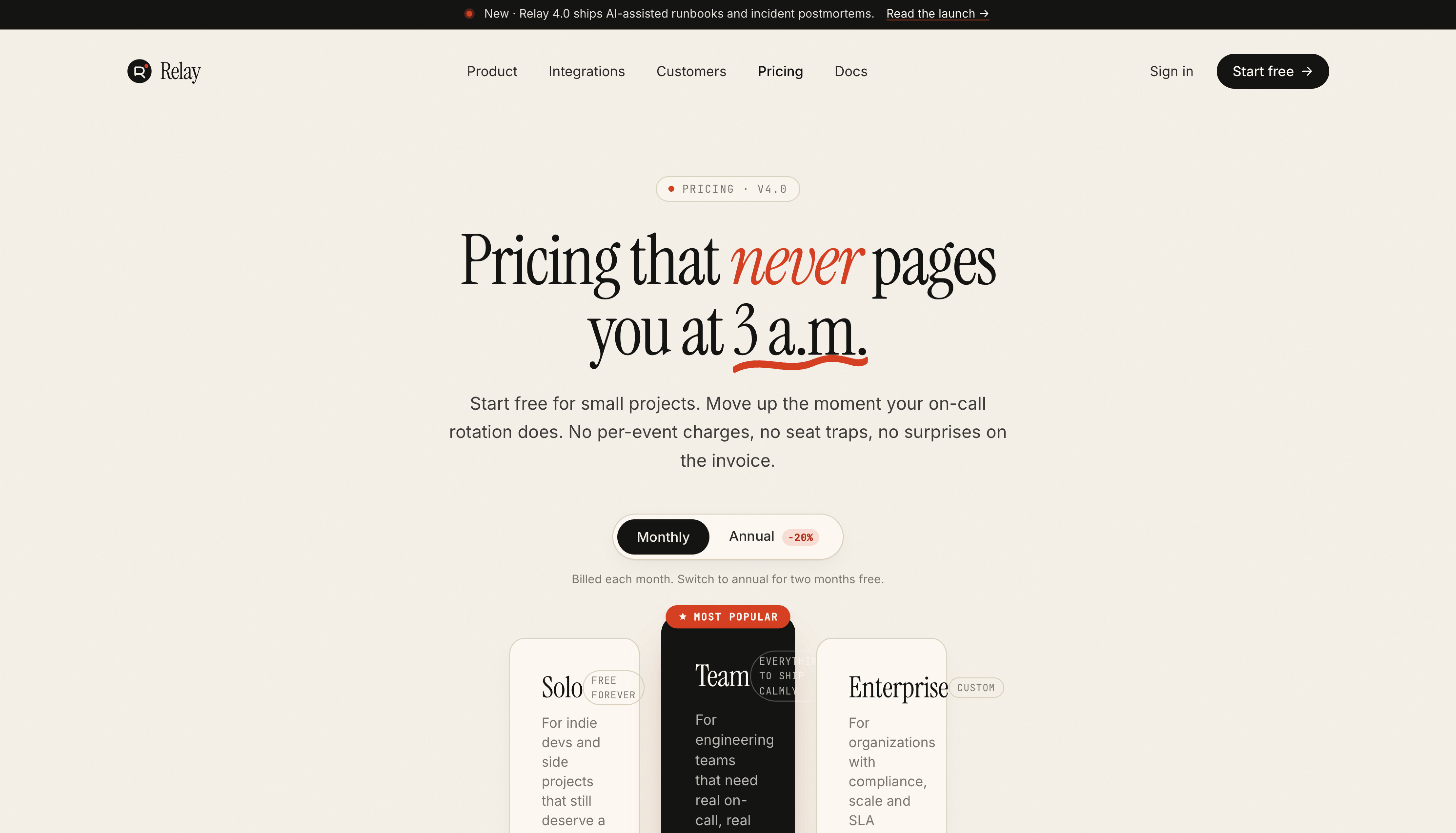 Claude Opus 4.7 took a riskier approach: a warm cream background with a charcoal middle tier pushed forward via z-index overlap. Italic-serif headline (”Pricing that never pages you at 3 a.m.”) with a hand-drawn underline SVG. The palette is more specific.