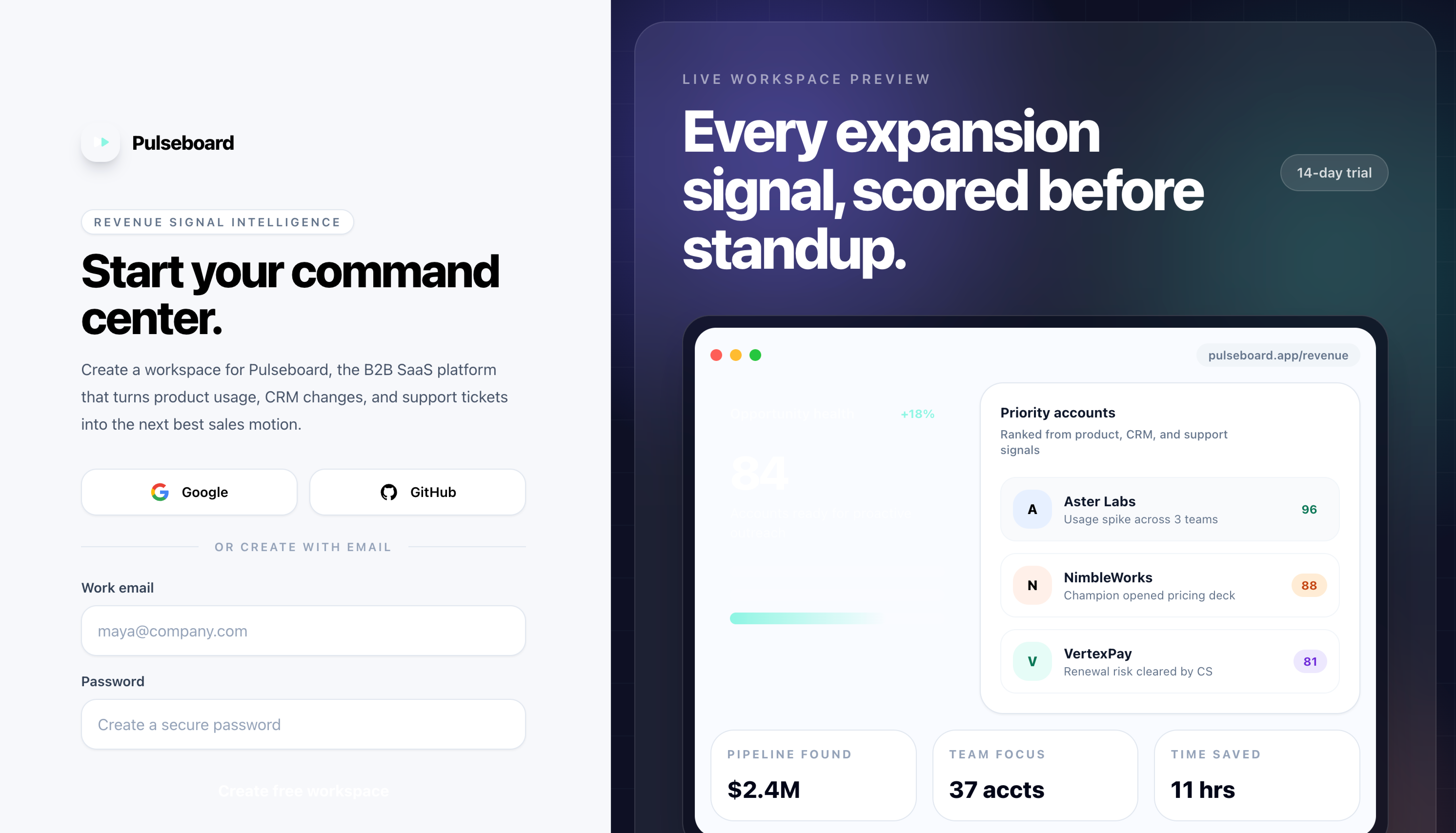 Both models reached for the split-screen pattern (form on the left, marketing panel on the right), which is what most modern B2B sign-ups look like.