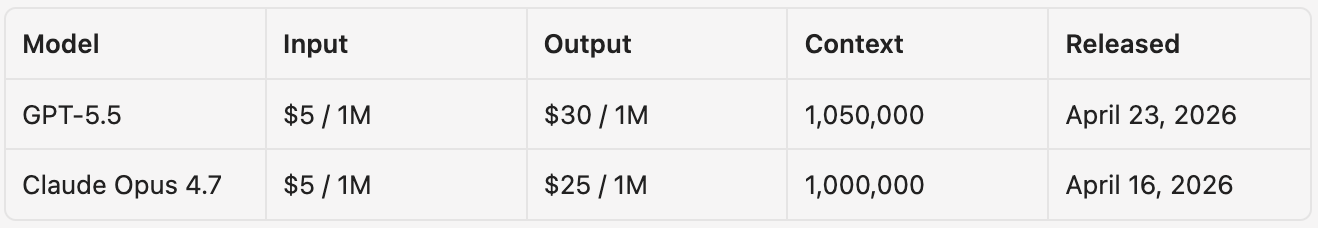 Both OpenAI and Anthropic shipped their frontier coding models this month: GPT-5.5 on April 23, 2026, and Claude Opus 4.7 a week earlier on April 16.