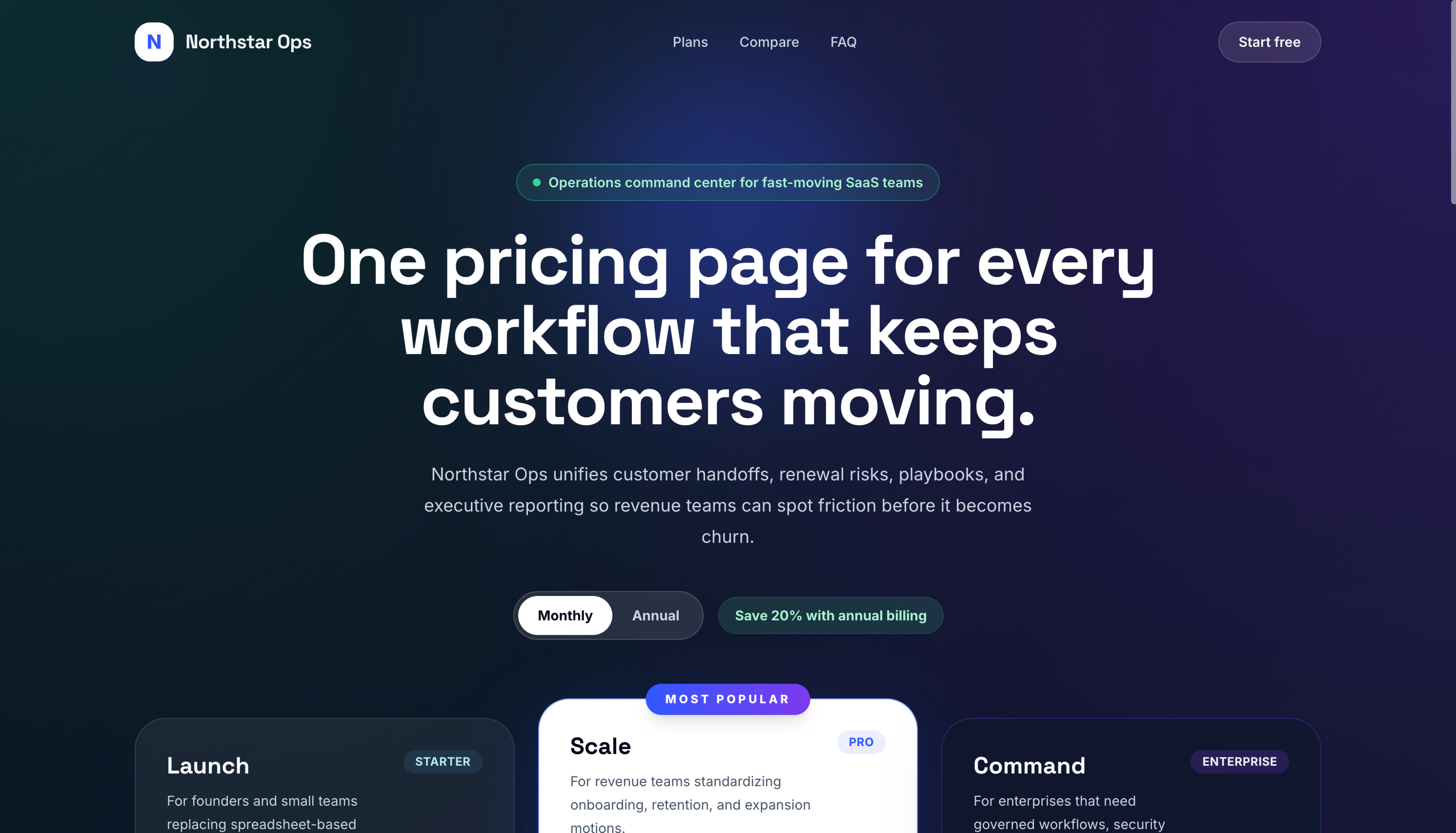 GPT-5.5 played the standard SaaS dark-mode pricing playbook: dark blue/purple gradient background, three tiers, the middle “Scale” tier flipped to white to draw the eye. It works. The annual toggle with “Save 20%” badge sits cleanly in the layout.