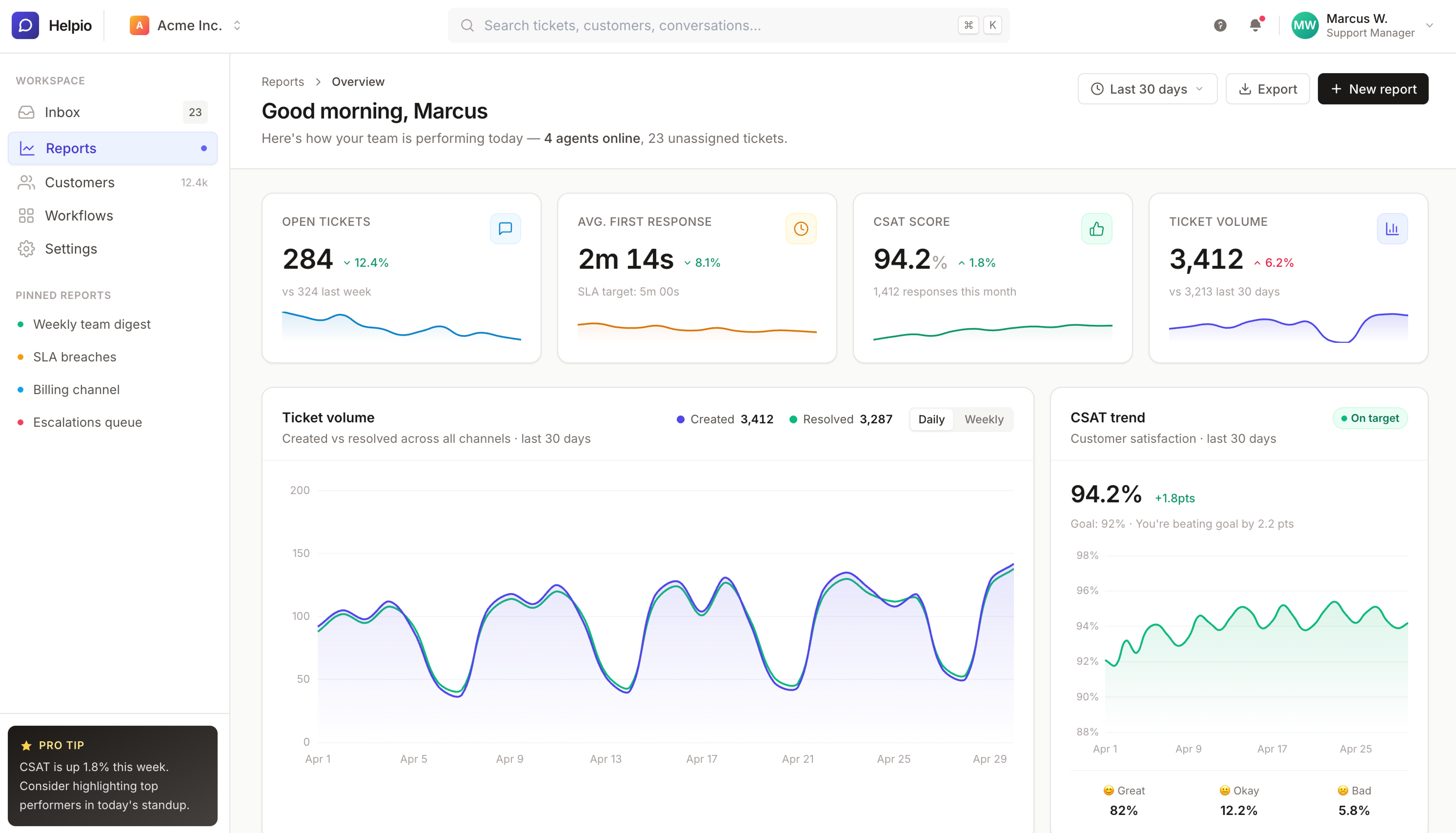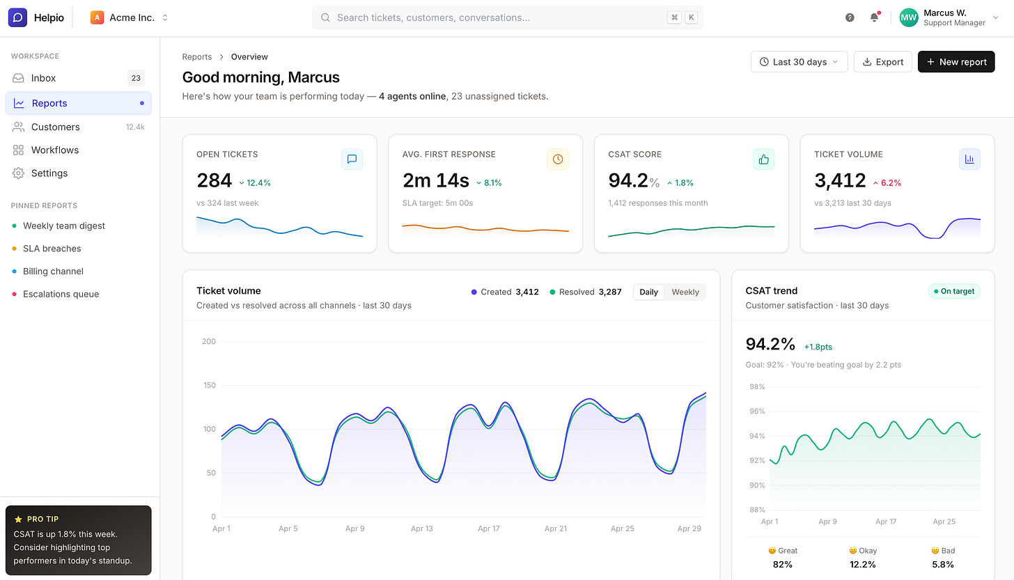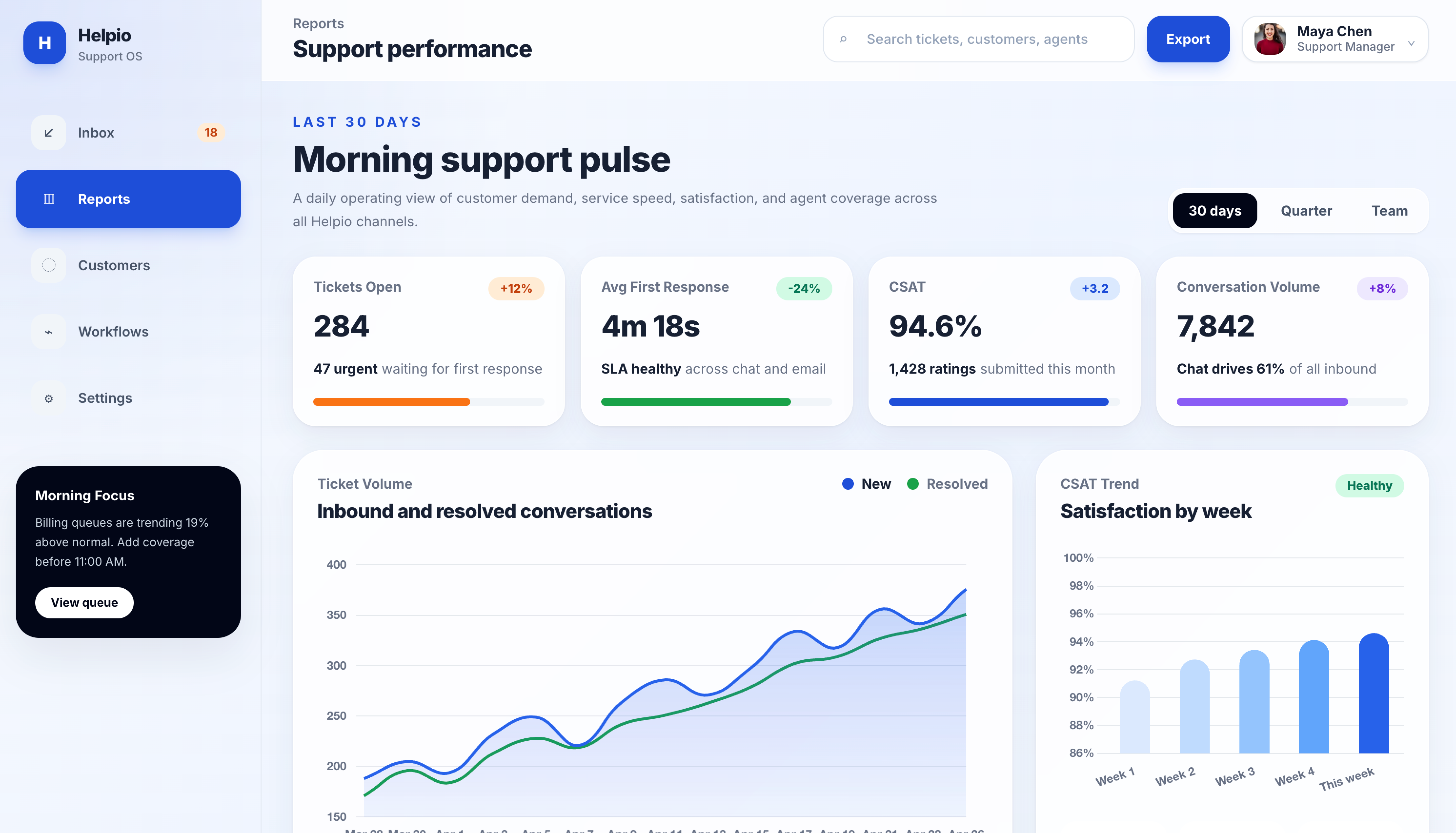 GPT-5.5 made the centerpiece the headline (”Morning support pulse”), inflated the metric numbers, and used soft smoothed Bezier curves on the charts that look more decorative than informational. The active sidebar item is a heavy bright blue.