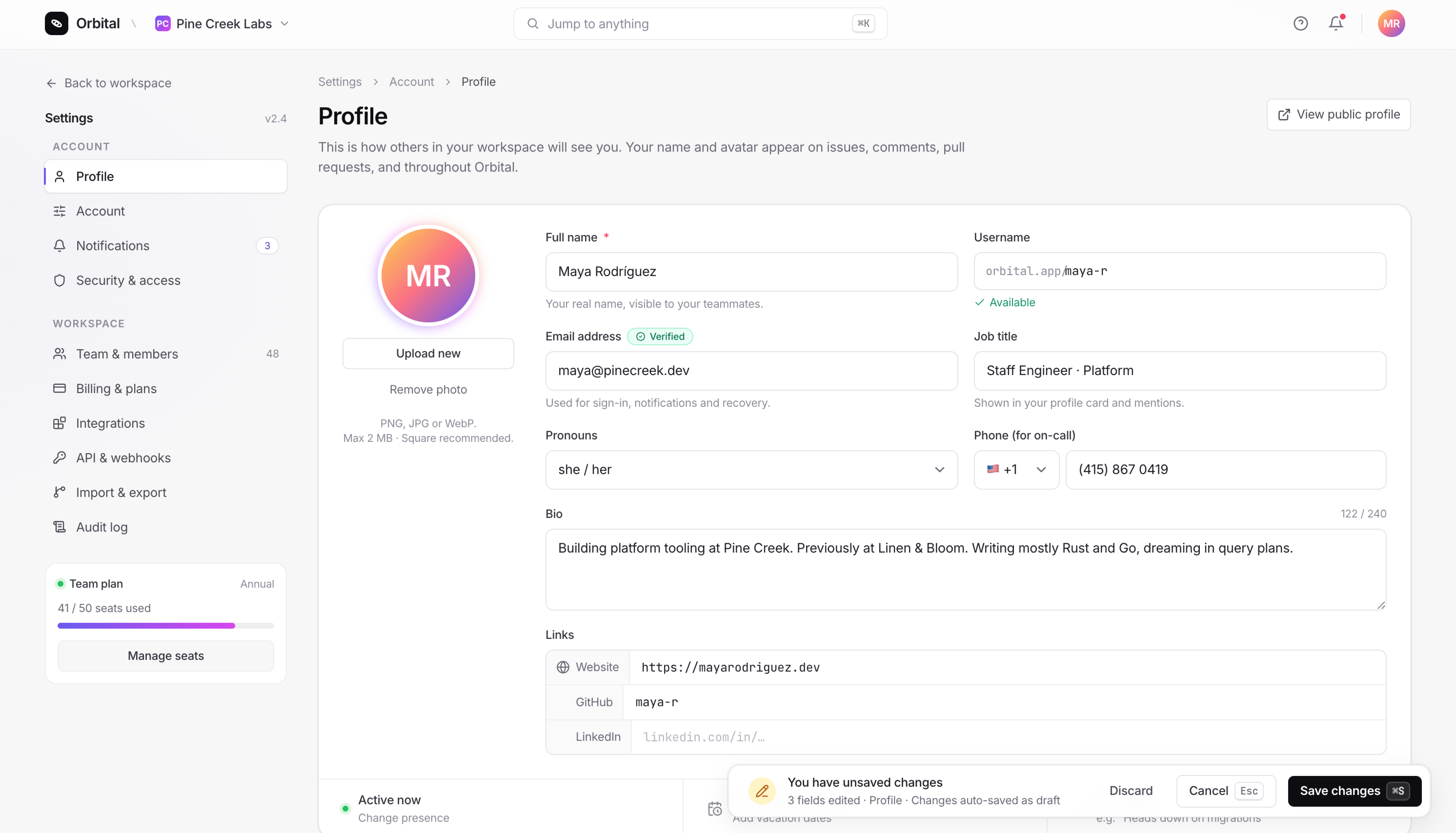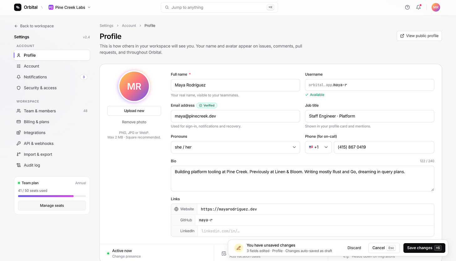 Claude Opus 4.7 used the standard left-sidebar / right-content pattern, kept the gray palette quiet, and handled Save/Cancel with a floating “unsaved changes” toast pinned to the bottom-right (the pattern Linear uses). Small touches like a verified badge on the email field and a country code dropdown on the phone field added the kind of detail that pushes a UI from prototype toward product.