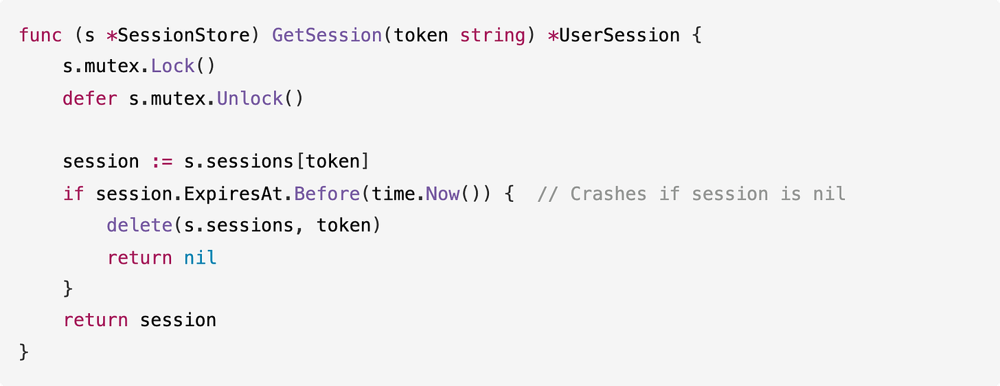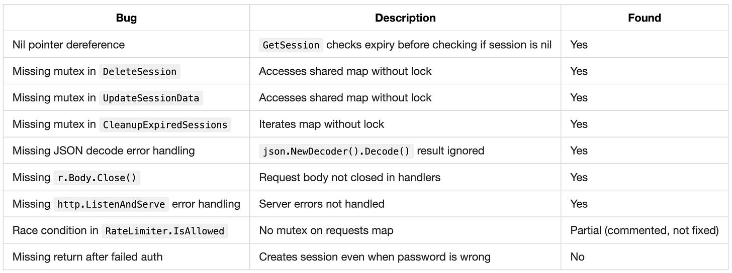 We wrote a Go session management system with intentional bugs including race conditions, nil pointer issues, and missing error handling.