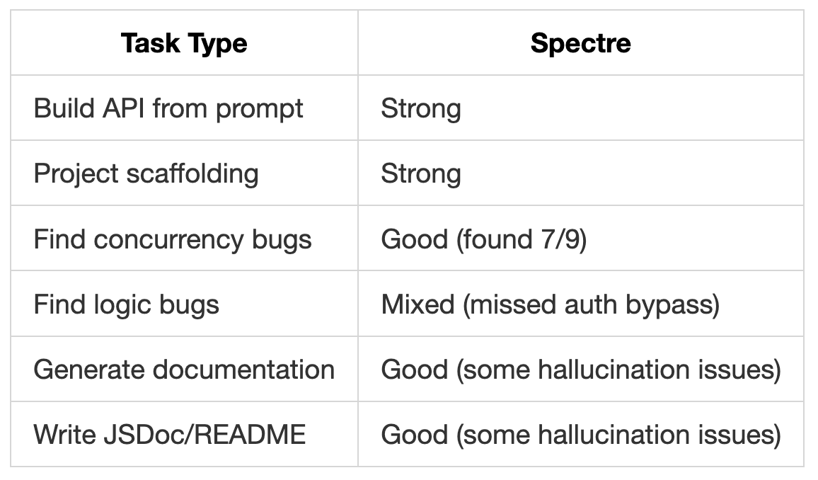 Based on these tests, Spectre handles implementation work well. The code generation test showed it can scaffold a complete project with proper structure. The bug detection found most issues but missed a critical auth bypass. The documentation output was thorough with practical examples.