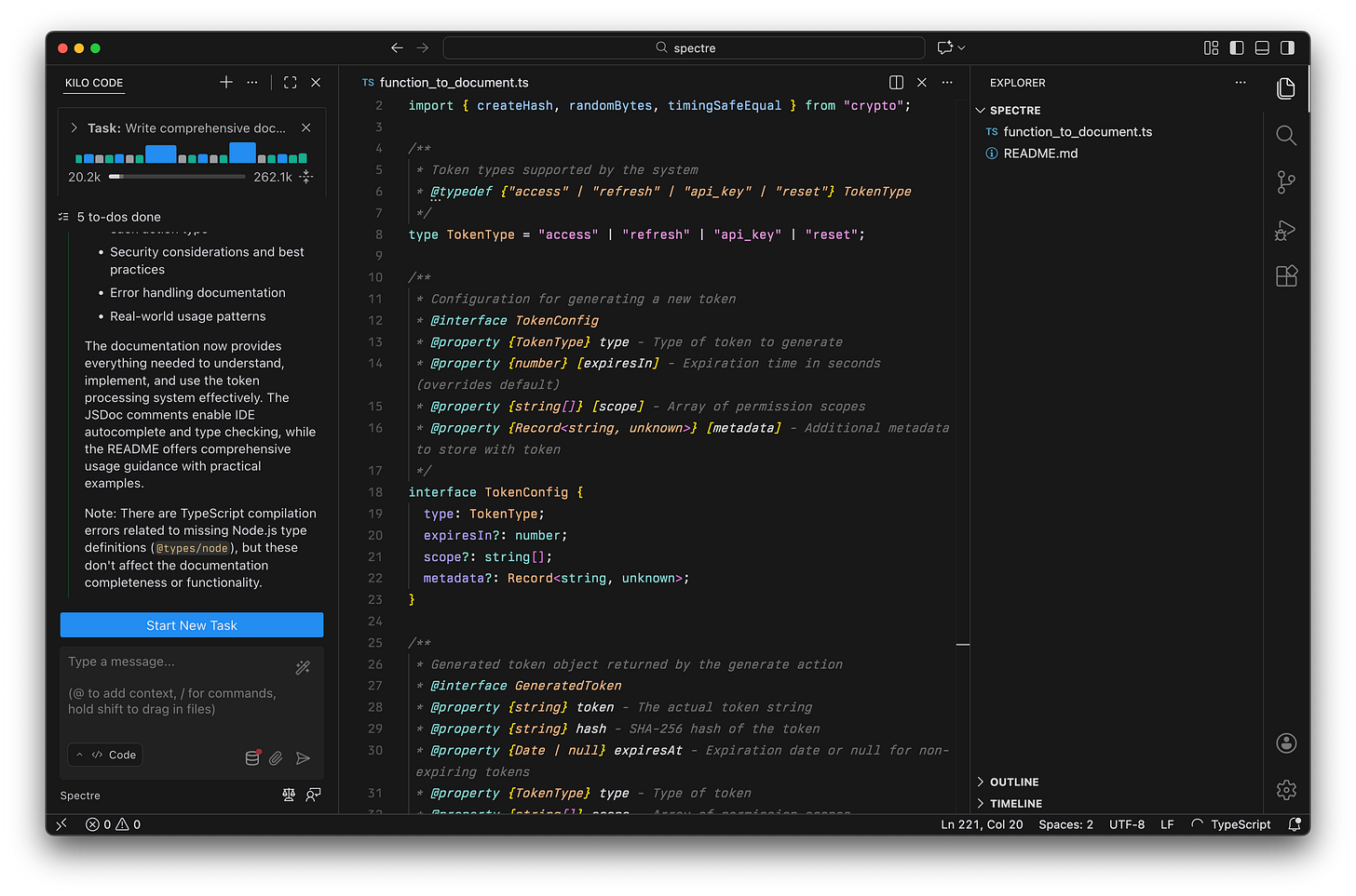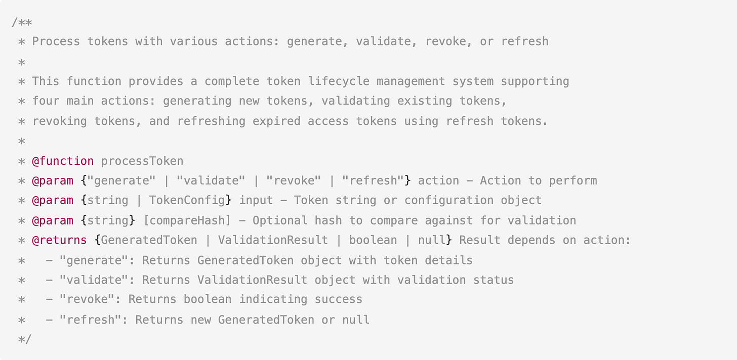 Documentation is another task that’s often offloaded to smaller, faster, and more affordable models. You already have working code and you just need it explained clearly. We wanted to see how Spectre handles this, so we gave it a complex TypeScript token management function (about 100 lines) that handles four different actions: generate, validate, revoke, and refresh tokens.