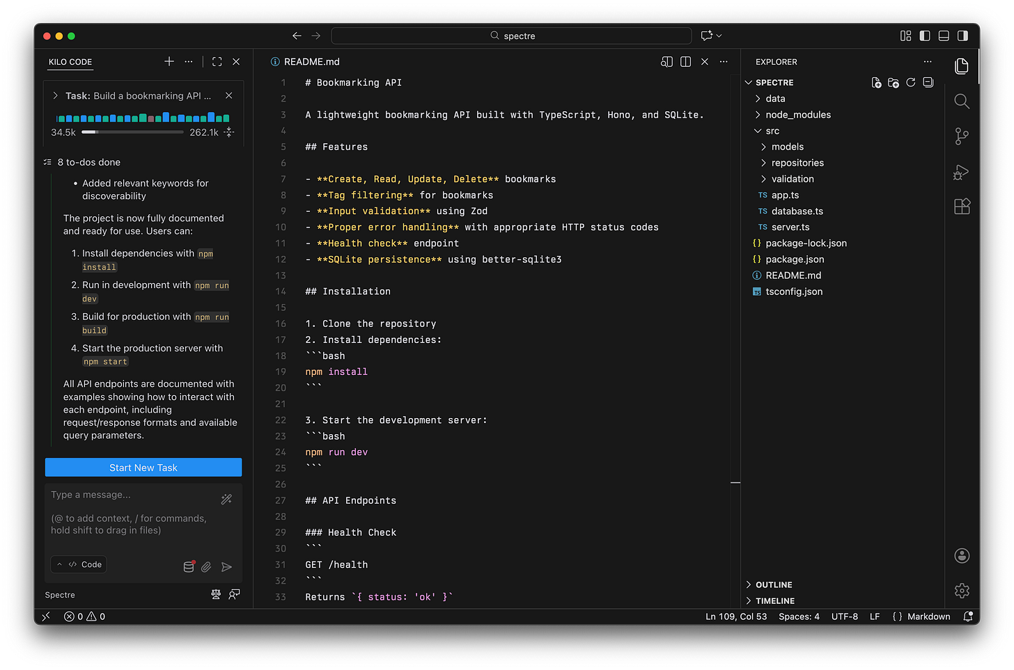 5. Include a health check endpoint at GET /healthThe results: Spectre set up the entire project from scratch with package.json, dev and start scripts, TypeScript configuration, and a multi-file architecture all in one go. After generating the code, it started the server and ran curl commands to verify each endpoint worked correctly.