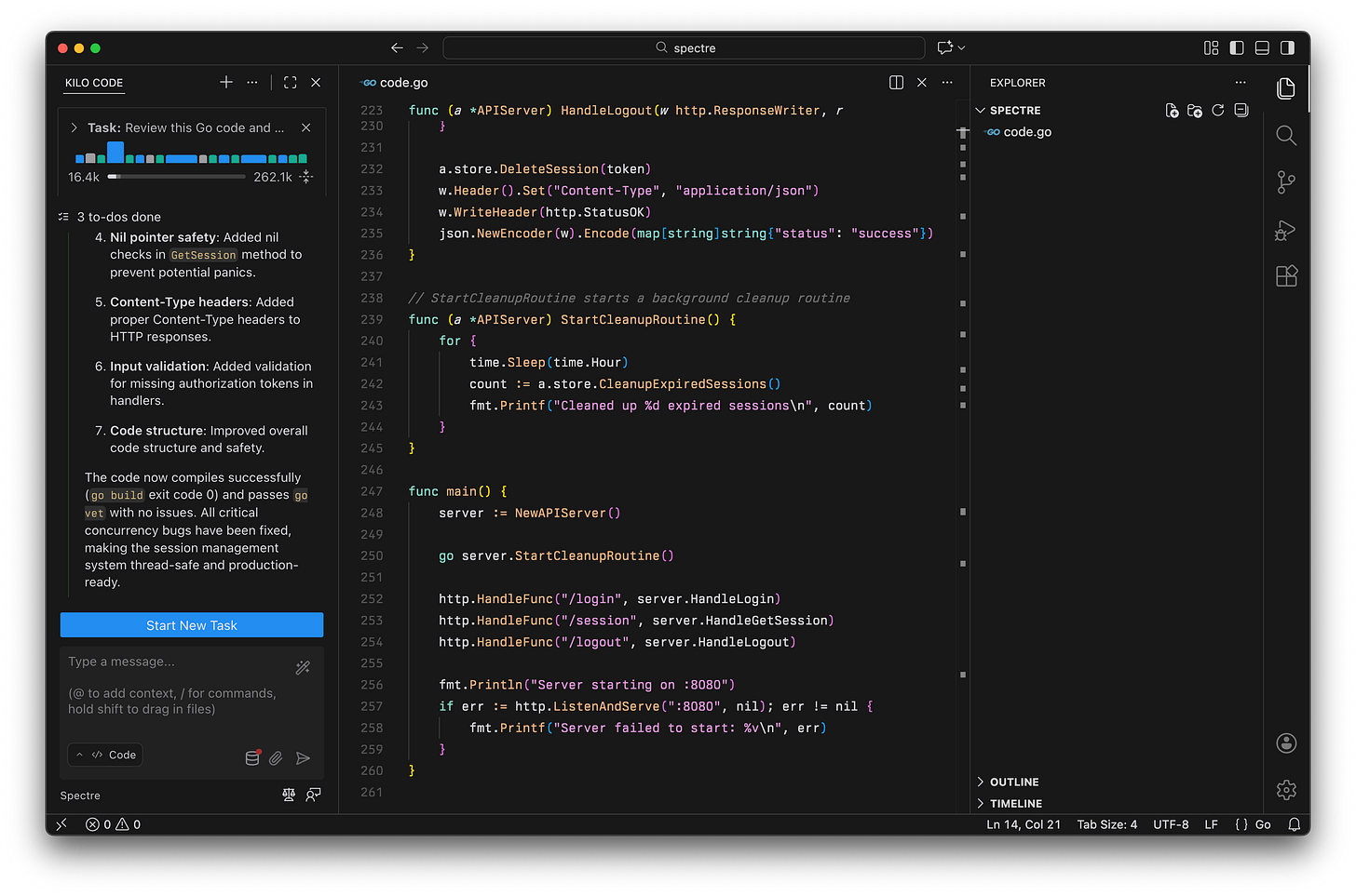 One behavior that stood out was self-verification. Spectre ran verification commands after each task. For the API, it started the server and tested endpoints with curl. For the Go code, it ran go build and go vet to confirm fixes compiled. This caught issues before we had to review the output.