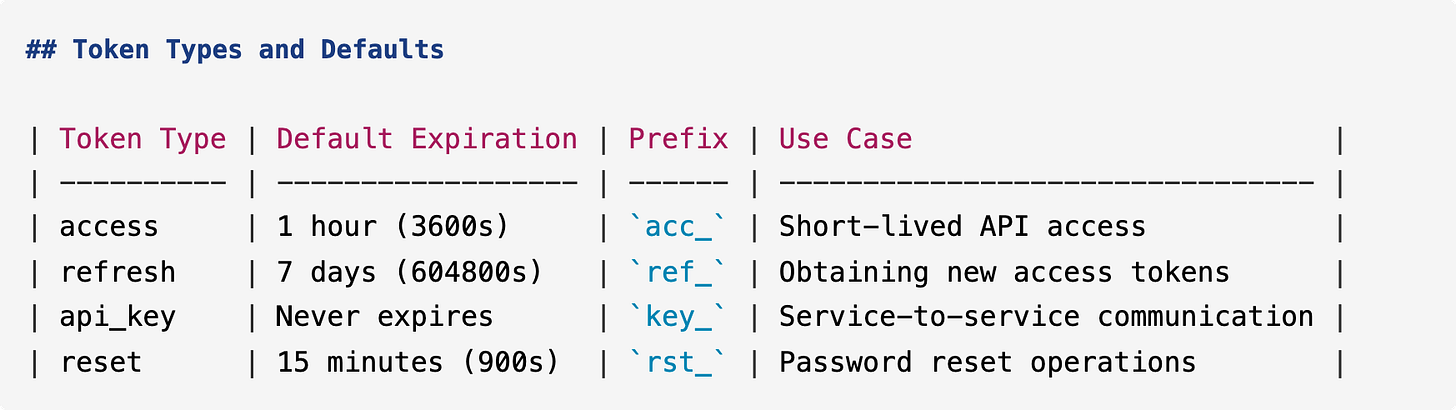 Spectre documented all interfaces (TokenConfig, GeneratedToken, ValidationResult), explained the security features (SHA-256 hashing, timing-safe comparison), and included practical examples showing common patterns like token refresh flows and error handling.