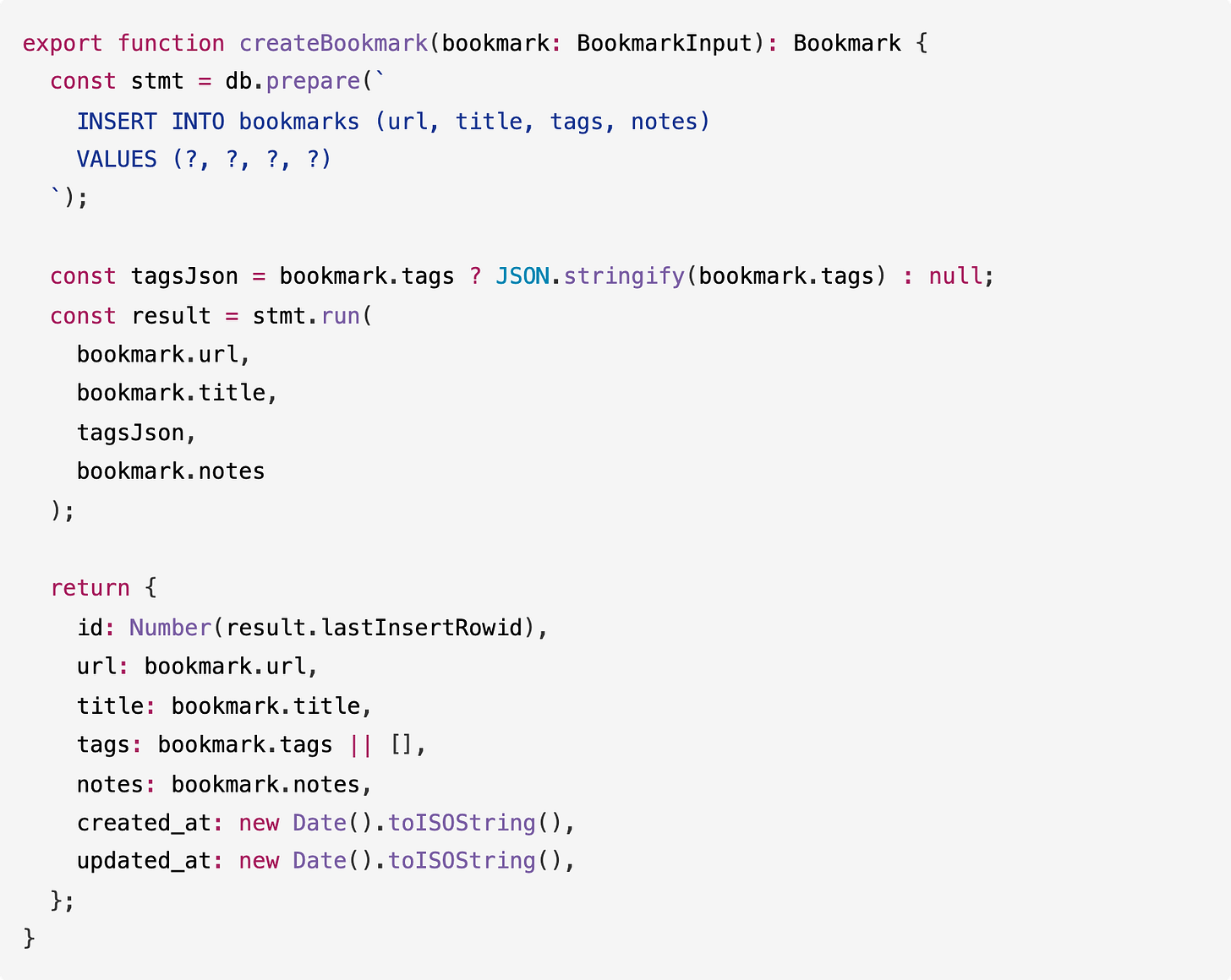 The repository layer handles database operations with proper JSON serialization for the tags array.