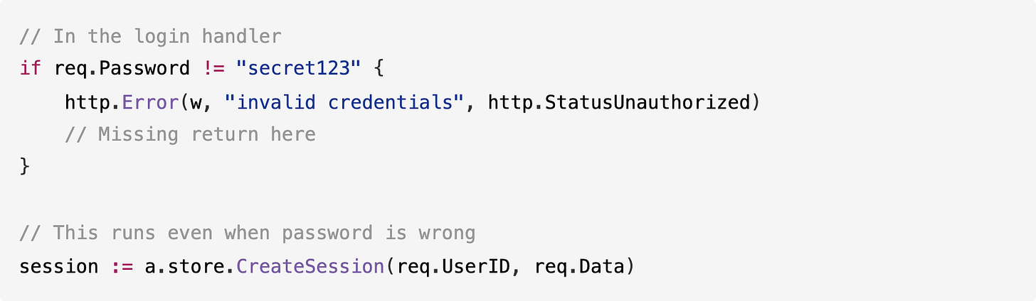 This means any login attempt creates a valid session regardless of the password. Spectre fixed the mutex bugs and nil pointer issues but missed this logic error.
