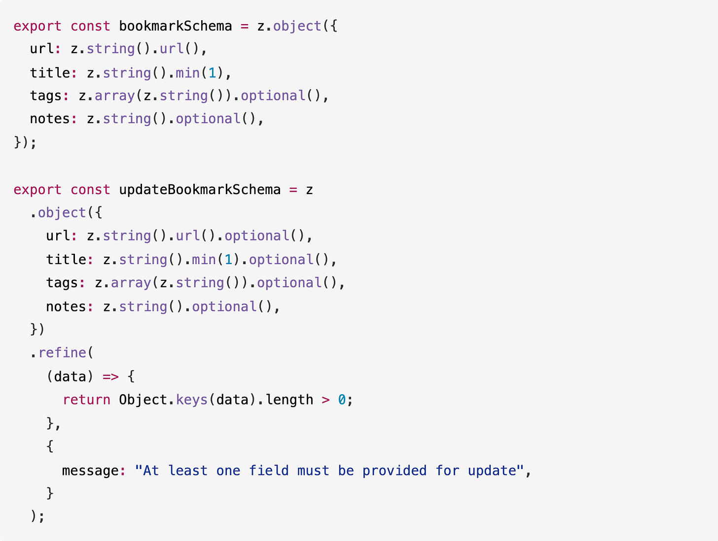 The validation layer shows clean Zod usage with separate schemas for create and update operations.