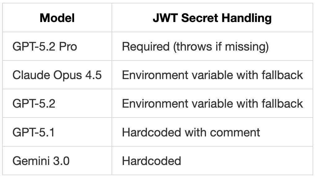 GPT-5.2 Pro was the only model to require the JWT secret as an environment variable, throwing an error at startup if it’s missing: