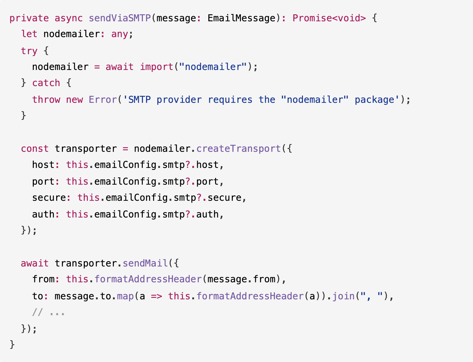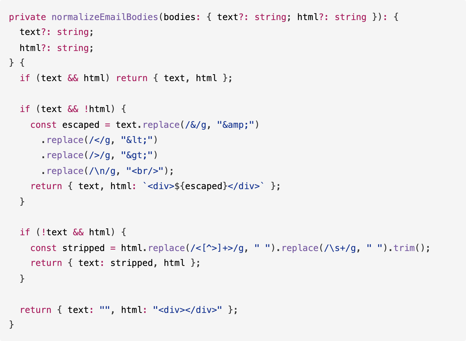 GPT-5.2 used dynamic imports for nodemailer and @aws-sdk/client-ses, allowing the code to work without those dependencies installed until they’re actually needed. It also added normalizeEmailBodies() to generate text from HTML or vice versa: