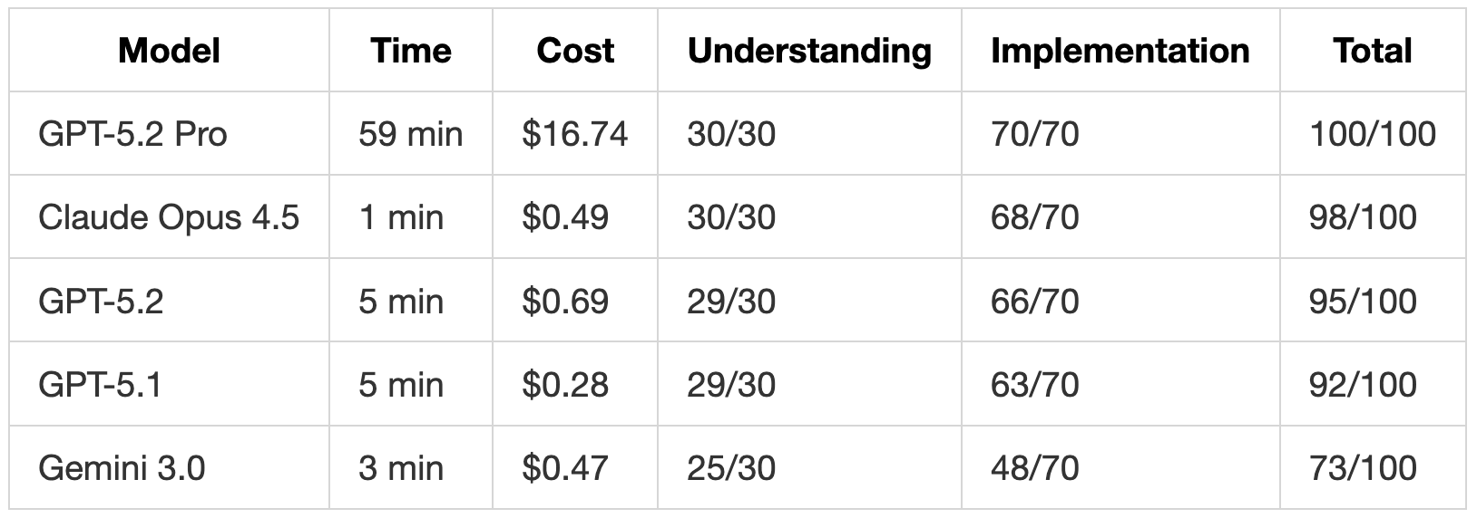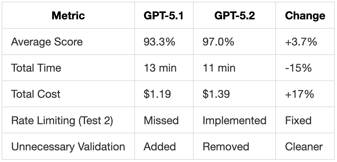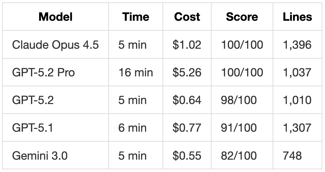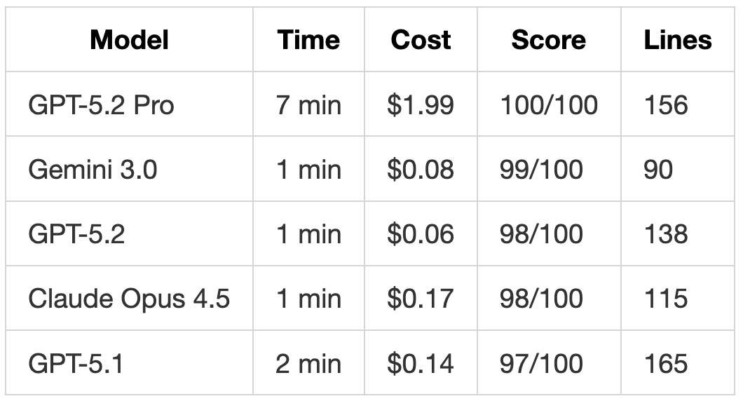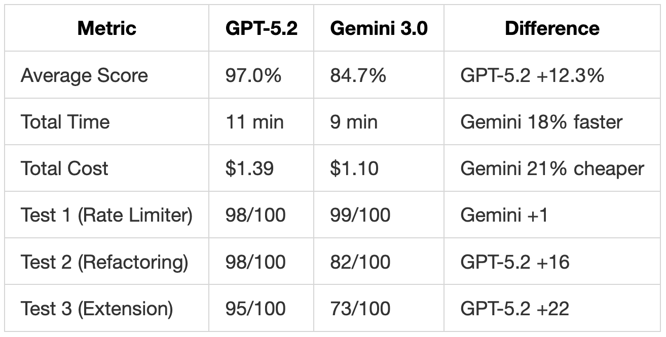 Gemini 3.0 is faster and cheaper, but the 12% score gap reflects real missing functionality. For simple, well-specified tasks, Gemini delivers clean results. For refactoring or extending existing systems, GPT-5.2 is more thorough.