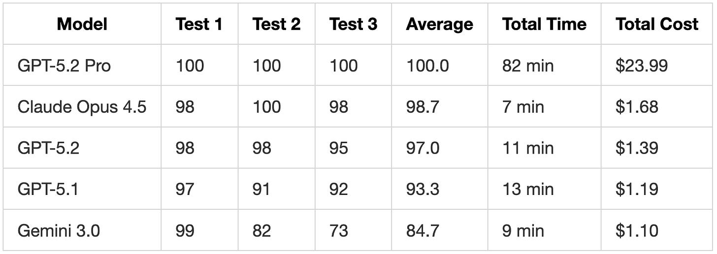 GPT-5.2 Pro achieved the first perfect score on this test. It spent 59 minutes reasoning through the problem, which is impractical for most use cases but shows what this model is capable of when given the time.