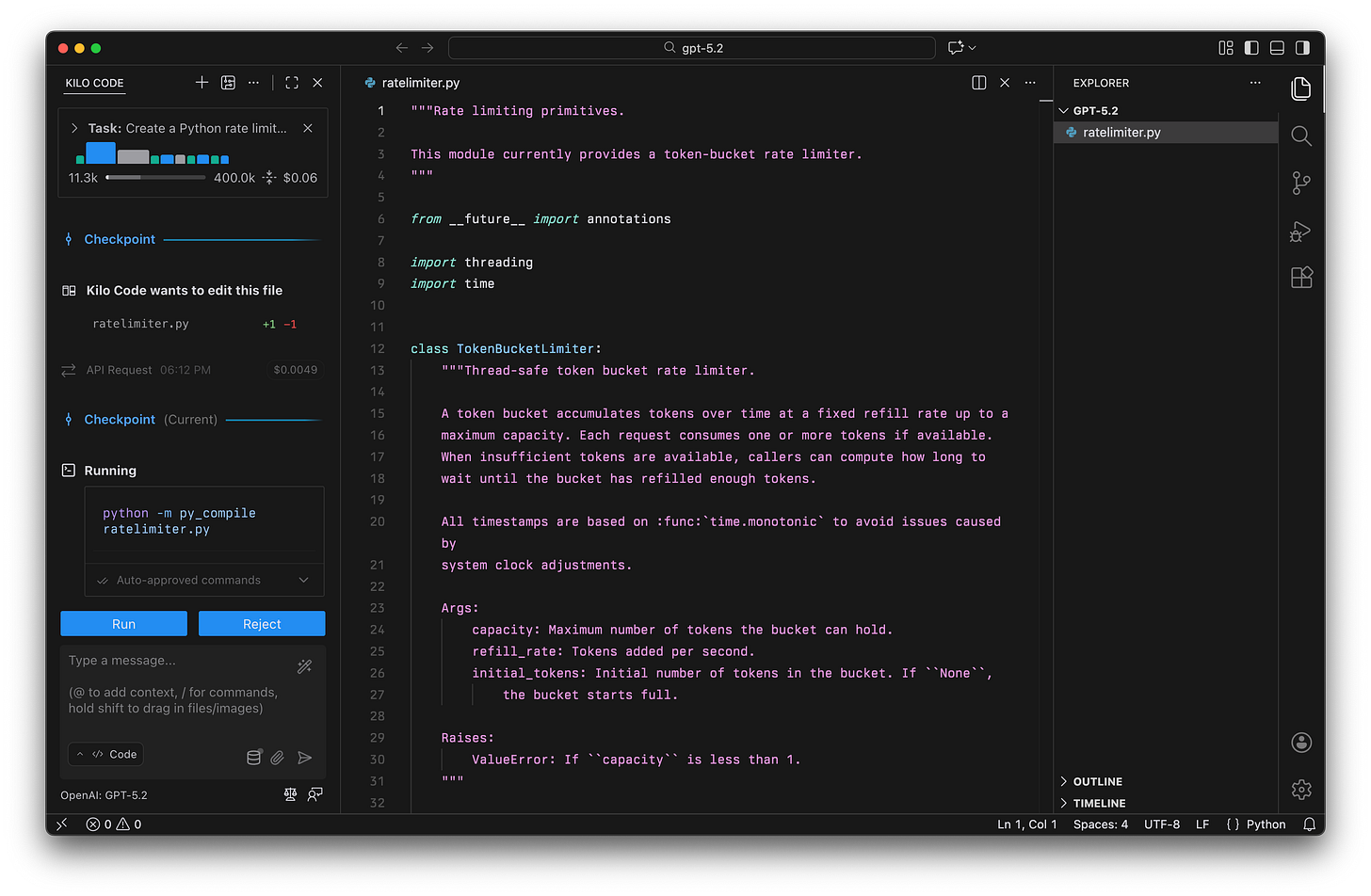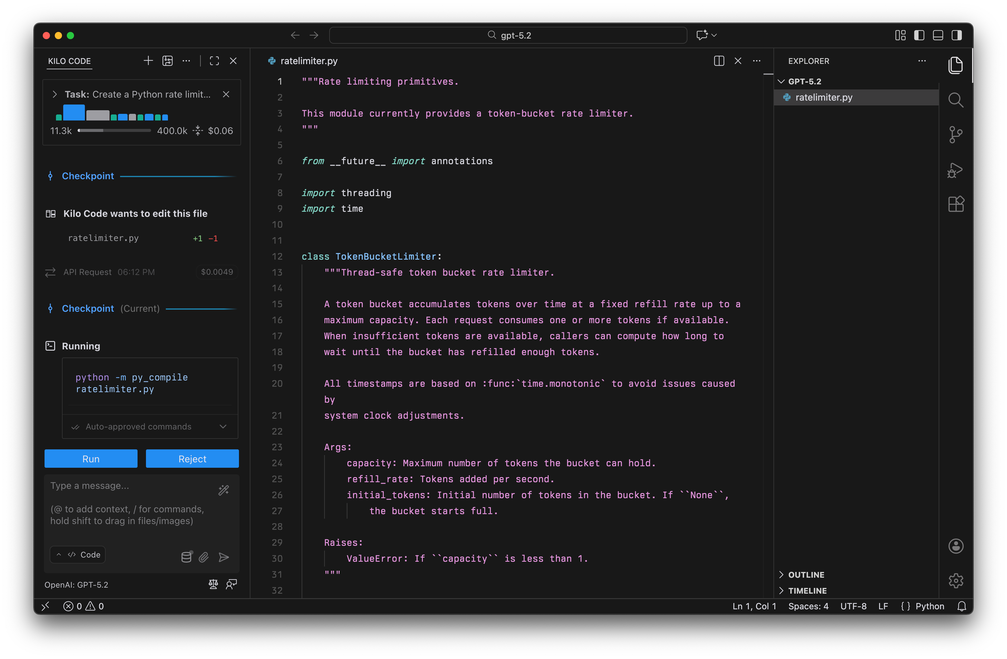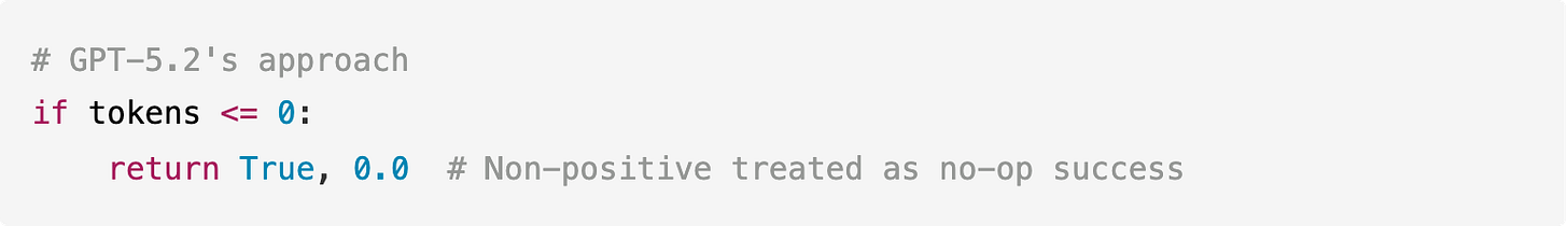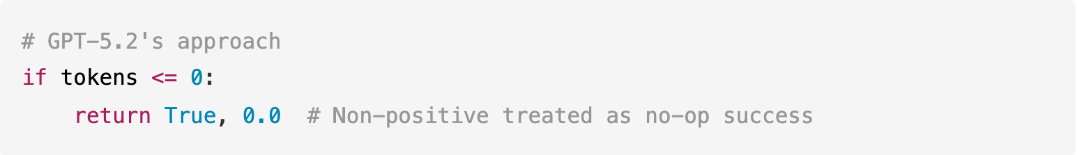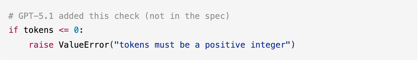 GPT-5.2 improved on GPT-5.1 in one key way: it stopped throwing unnecessary exceptions. GPT-5.1 added unrequested validation that raised ValueError for non-positive tokens: