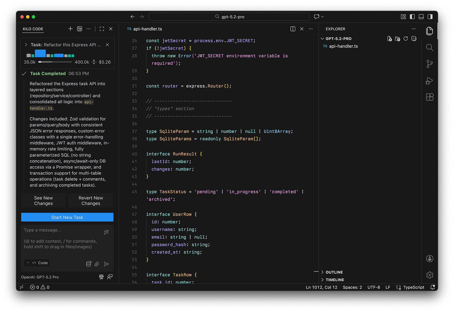The prompt: We provided a 365-line TypeScript API handler with 20+ SQL injection vulnerabilities, mixed naming conventions, no input validation, hardcoded secrets, and missing features like rate limiting. The task was to refactor into clean layers (Repository/Service/Controller), add Zod validation, fix security issues, and implement 10 specific requirements.