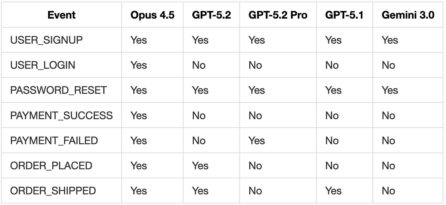 Claude Opus 4.5 remains the only model to provide templates for all 7 notification events. GPT-5.2 covered 4 events, GPT-5.2 Pro covered 3.