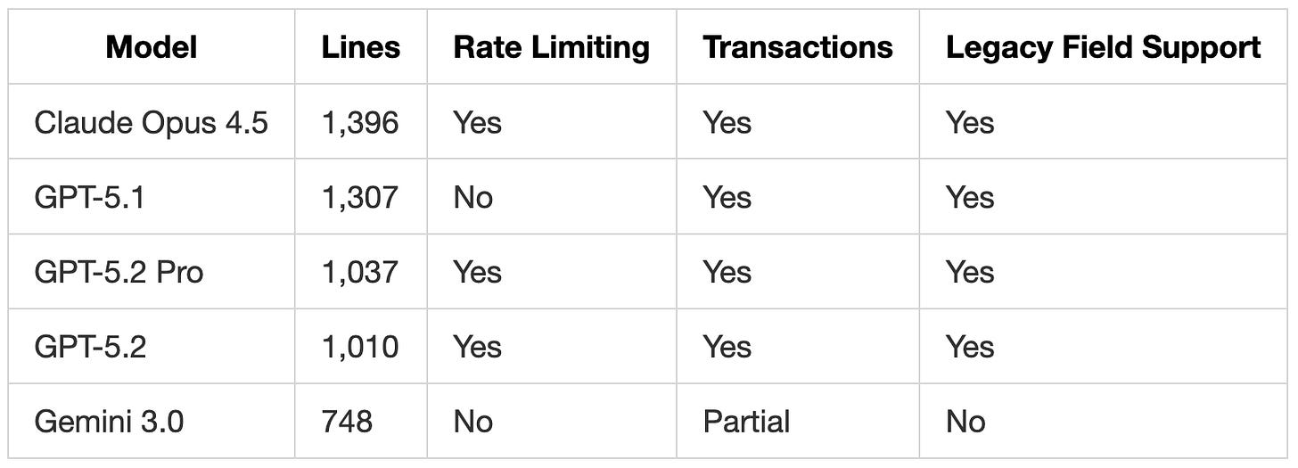 Gemini 3.0 won Test 1 by following the prompt most literally, producing the shortest code (90 lines) with exact spec compliance. But on more complex tasks (Tests 2 and 3), GPT-5.2 pulled ahead significantly. Gemini missed rate limiting entirely in Test 2, skipped database transactions, and produced a minimal email handler in Test 3 without CC/BCC support or proper recipient handling.