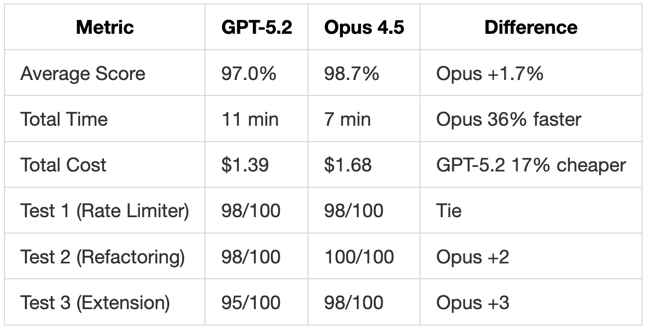 Claude Opus 4.5 scored slightly higher across the board while completing tasks faster. The difference is most visible in Test 2, where Opus 4.5 was the only model (besides GPT-5.2 Pro) to implement all 10 requirements including rate limiting with full headers. In Test 3, Opus 4.5 provided templates for all 7 notification events while GPT-5.2 covered 4.