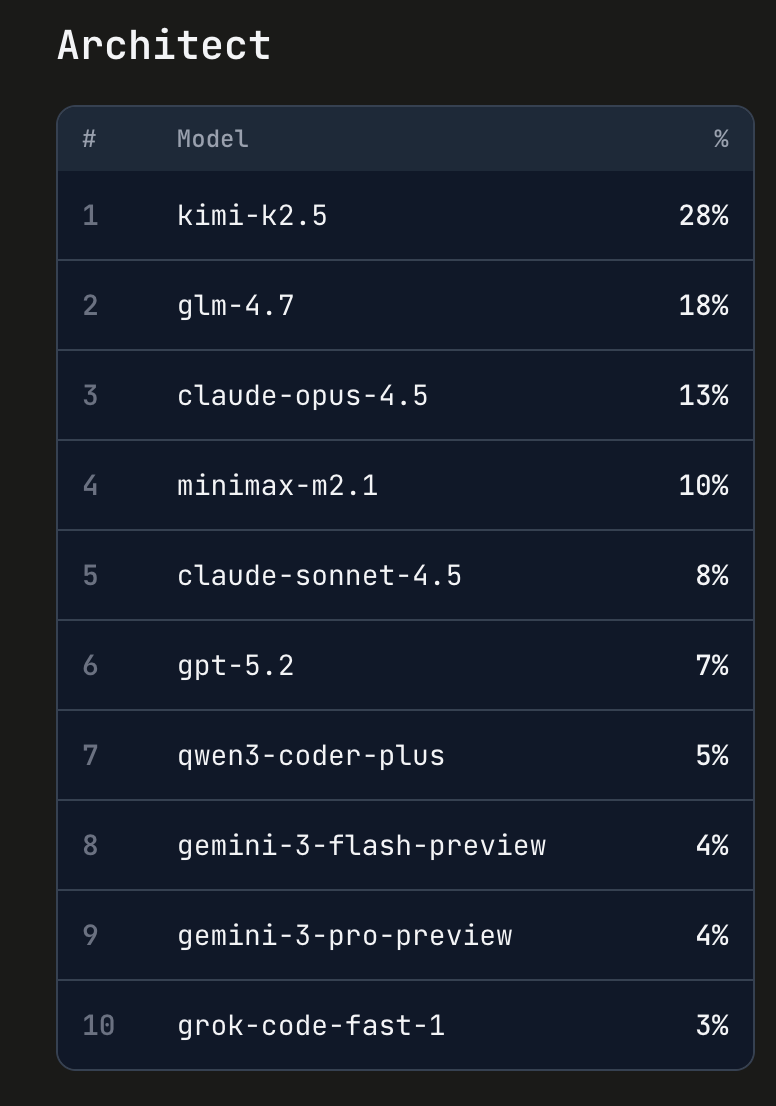 Perhaps most telling was Kimi K2.5’s rapid ascent in Architect mode. Within days, it climbed to become one of the top-performing models for architectural planning and system design tasks. Typically this kind of climb takes several weeks, no matter how good or well-publicized the model might be. Developers praised its ability to reason through complex codebases, suggest refactoring strategies, and maintain context across large-scale projects.